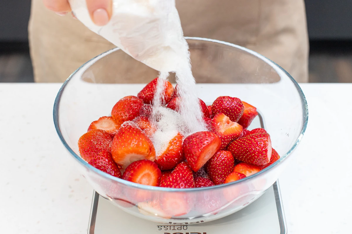 Переложите в миску, насыпьте сахар в соотношении 2:1 (у нас на 1 кг клубники без плодоножек ушло 0,5 кг сахара). Оставьте на 3-4 часа, пока клубника не даст сок. Если в помещении слишком жарко, уберите ягоды с сахаром в холод. Важно: чем более плотные у вас ягоды, тем больше времени потребуется на выделение сока.