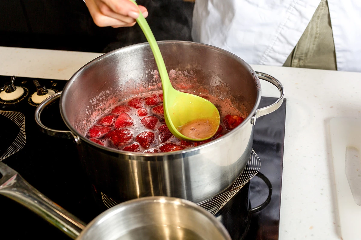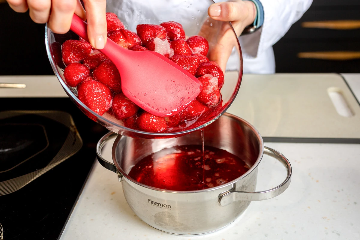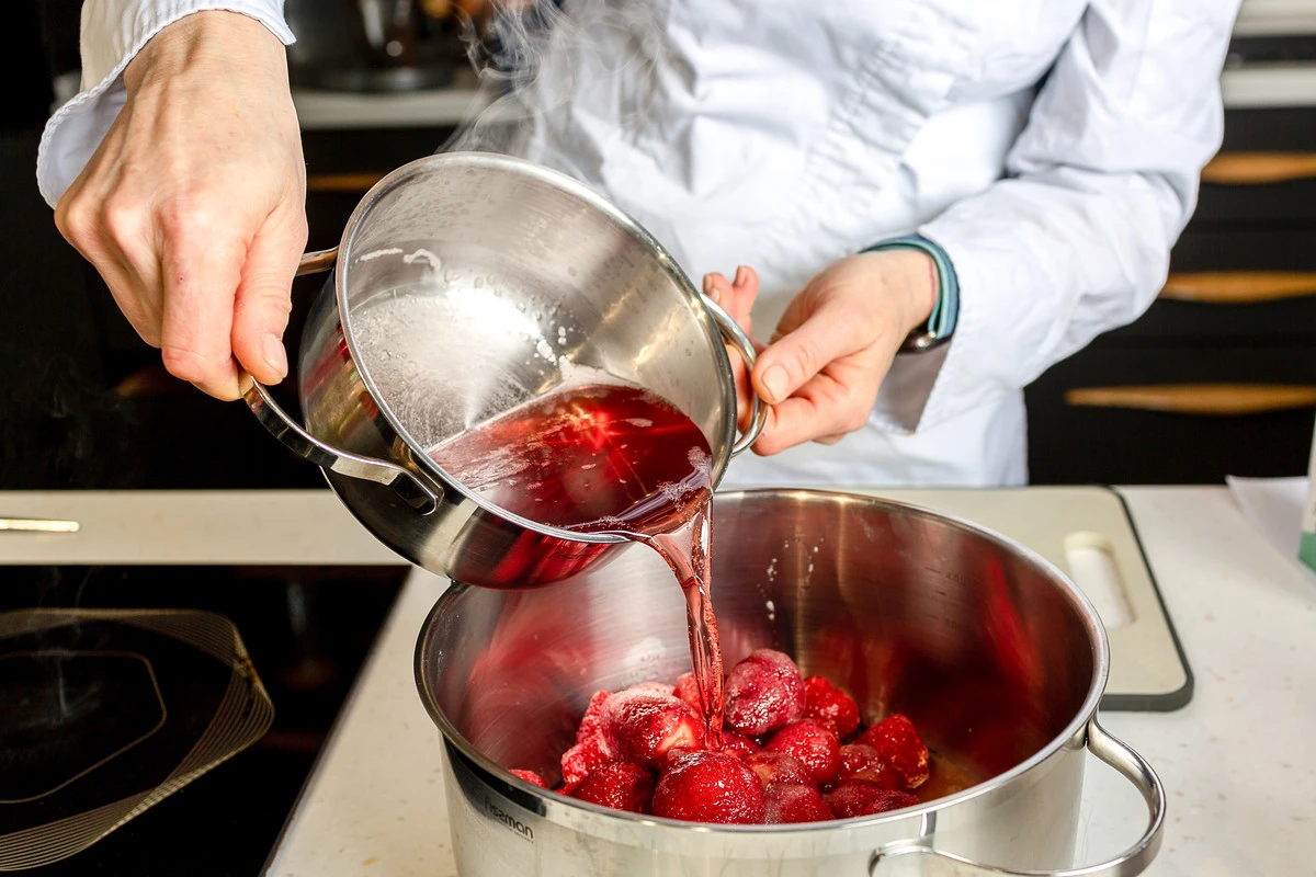 Когда клубника даст сок, слейте получившийся сироп в ковш. Ягоды пока отложите.