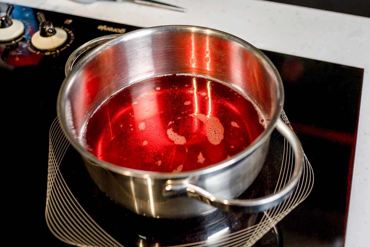 Затем ещё раз нагрейте всё вместе в течение 5 минут. Снимите пену. Перемешайте.
