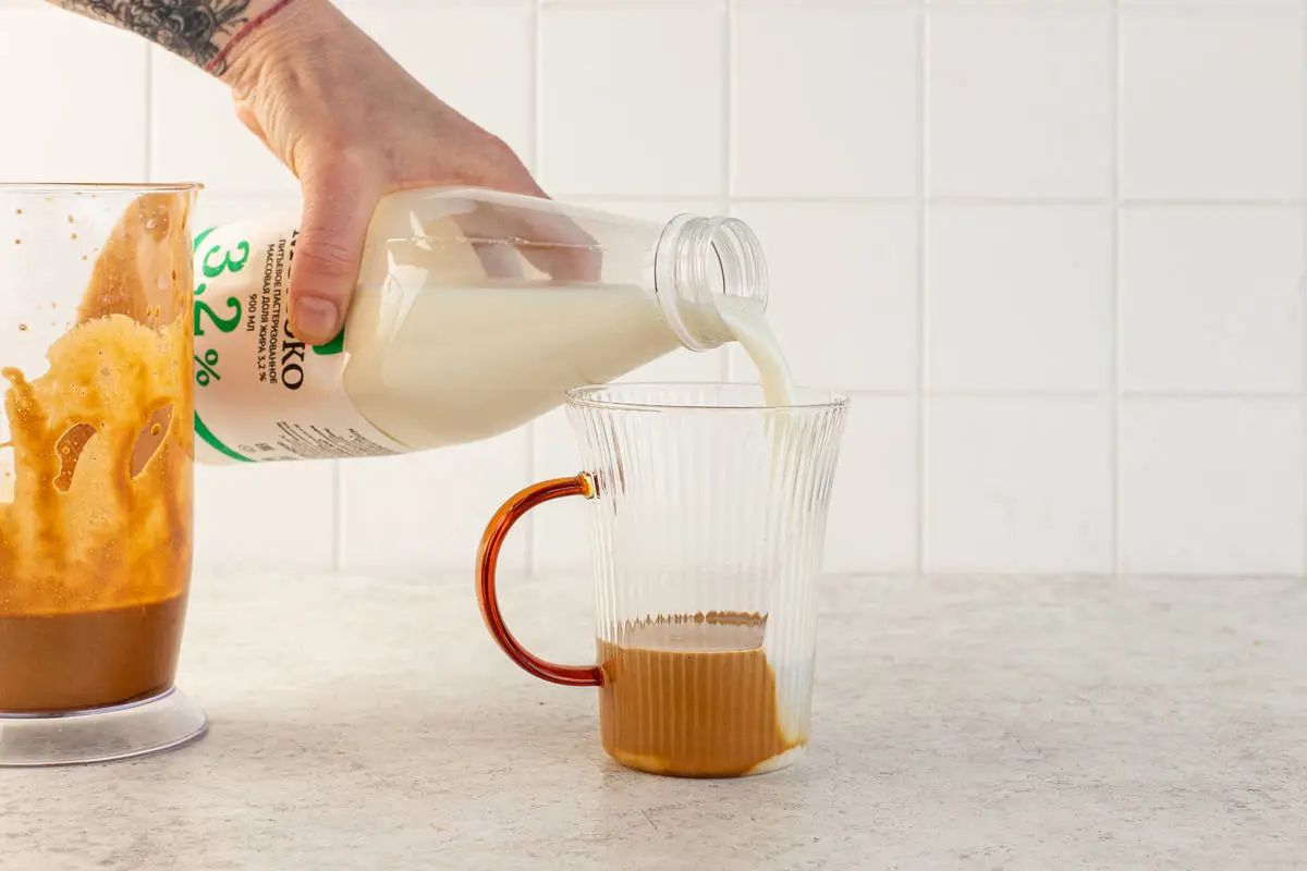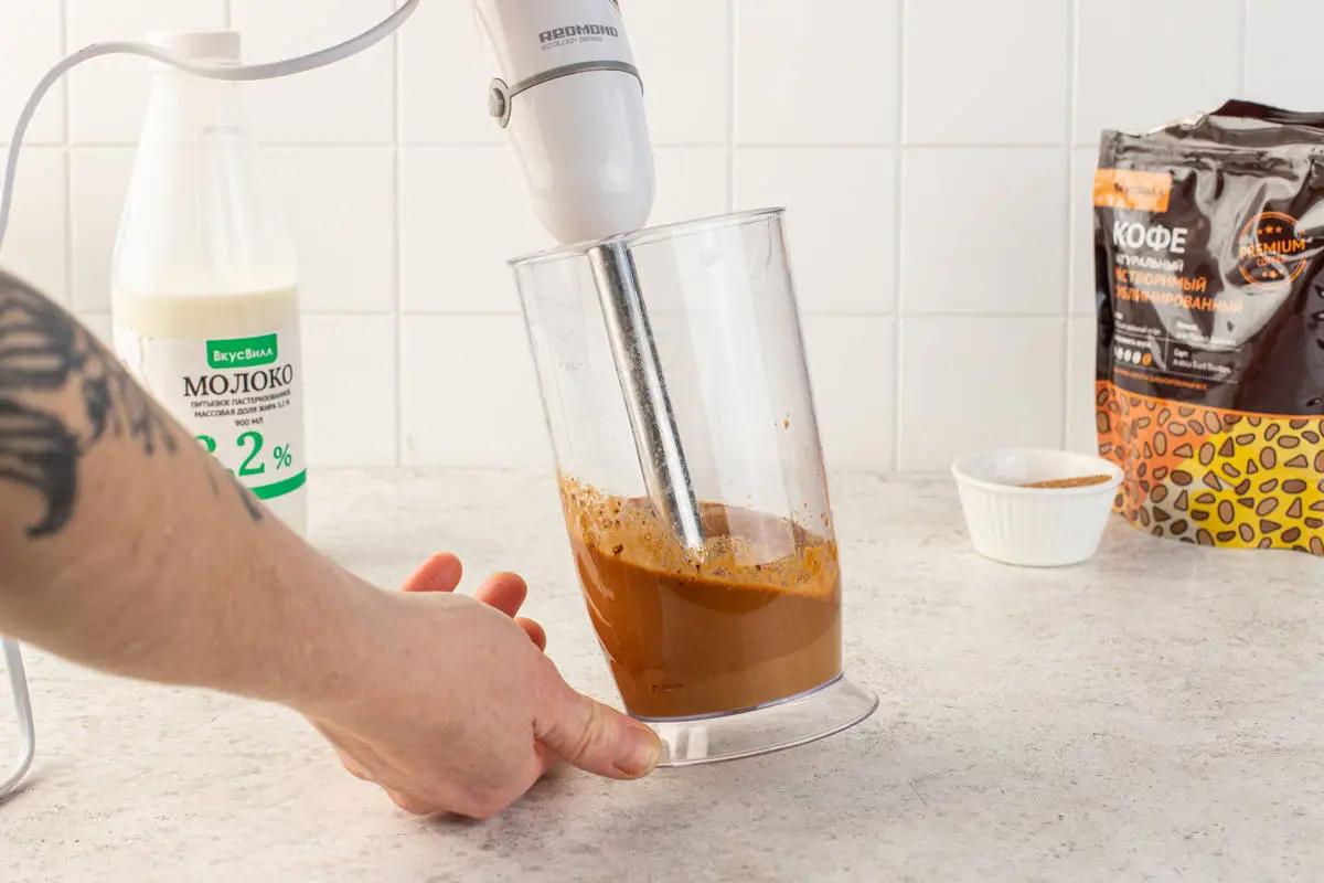 Разложите кофейную пену в стаканы со льдом, аккуратно влейте холодное молоко, стараясь не повредить «шапочку».