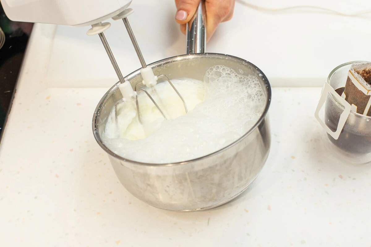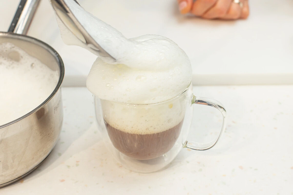 Молоко налейте в ковш, нагрейте до появления над молоком «дымка» и сразу же снимите с огня — молоко не должно закипеть. Взбейте молоко миксером до образования пышной пены.