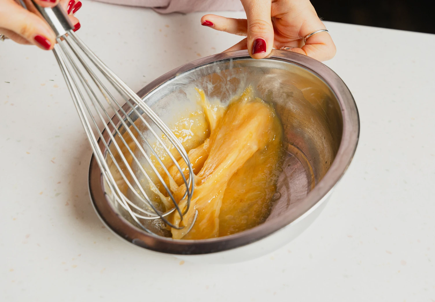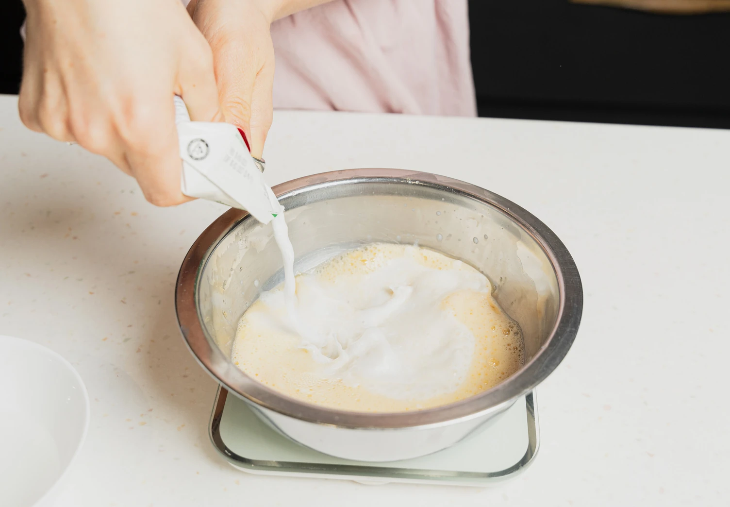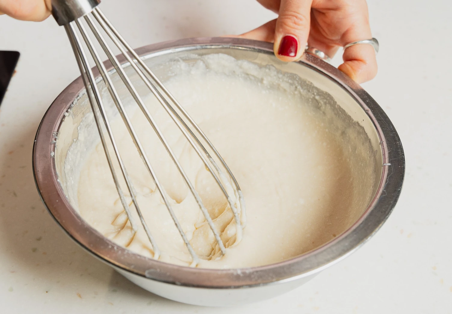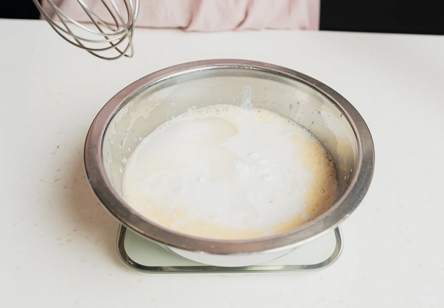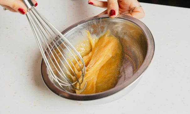 Влейте кокосовое молоко и растопленное кокосовое масло. Тщательно перемешайте венчиком.