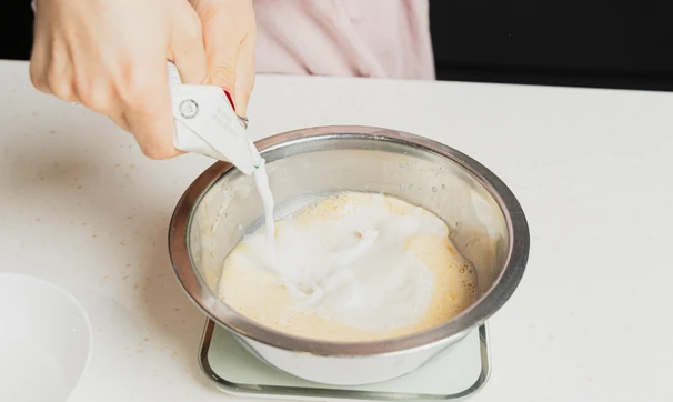 Постепенно, в несколько приёмов, всыпьте муку, смешанную с разрыхлителем. Перемешайте до гладкой однородной текстуры без комочков.