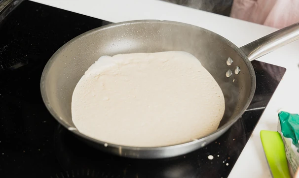 Поставьте сковороду на сильный огонь и хорошо разогрейте её. Перед выпеканием первого блина смажьте сковороду маслом. Второй и последующие блины можно печь на сухой сковороде.