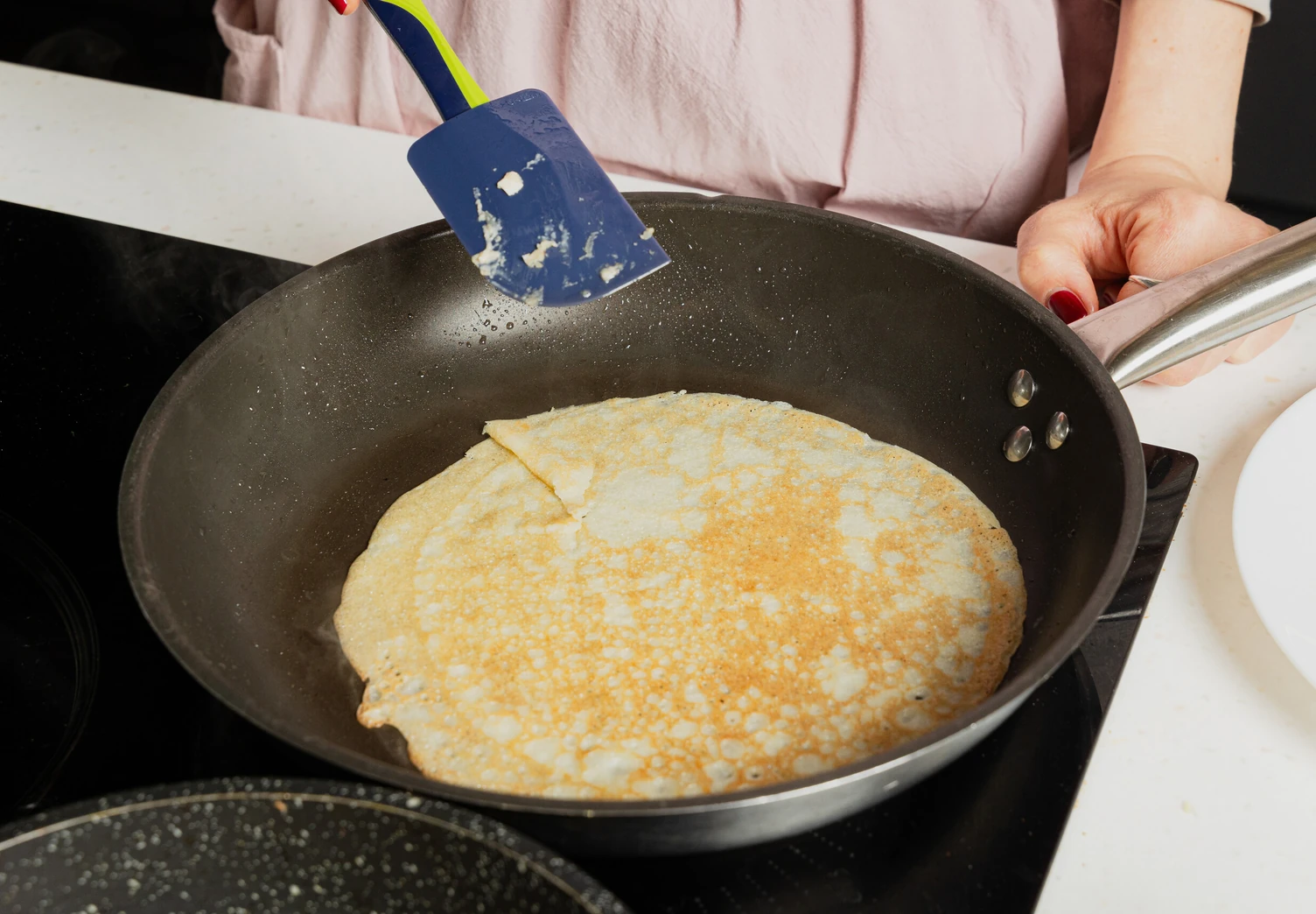 Выпекайте блины с одной стороны до золотистого цвета, затем аккуратно переверните и подрумяньте с другой стороны.