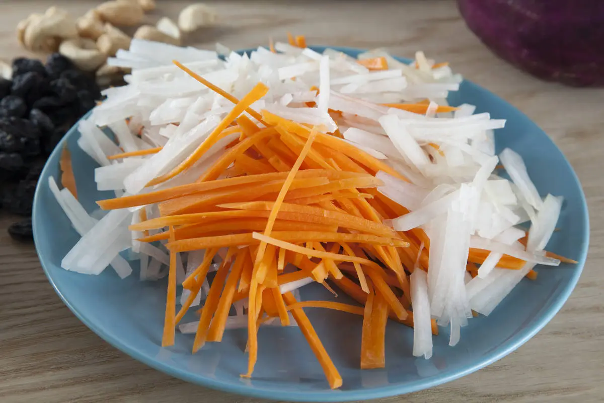 Дайкон и морковь очистите и натрите на терке для корейской моркови или нарежьте тонкими брусочками при помощи острого ножа и смешайте с капустой.