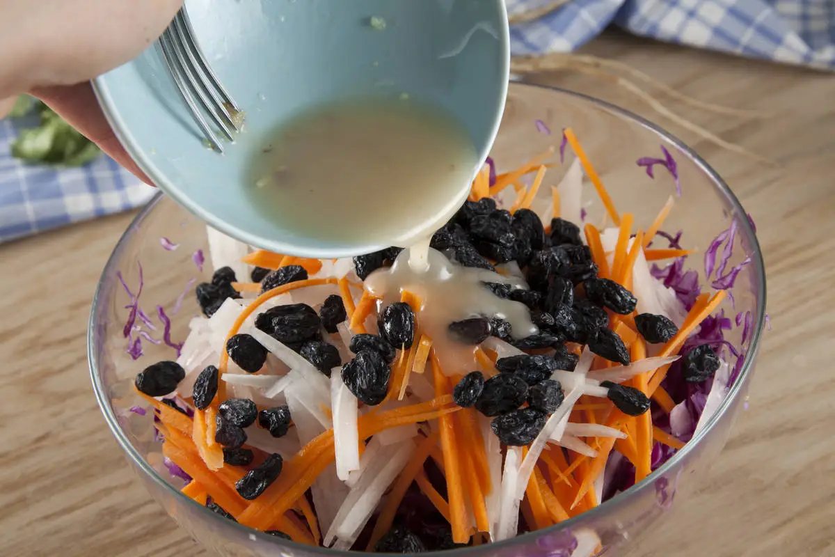 Полейте салат заправкой, добавьте обсушенный от воды изюм и перемешайте. Подавайте, посыпав рубленой зеленью кинзы и орехами.