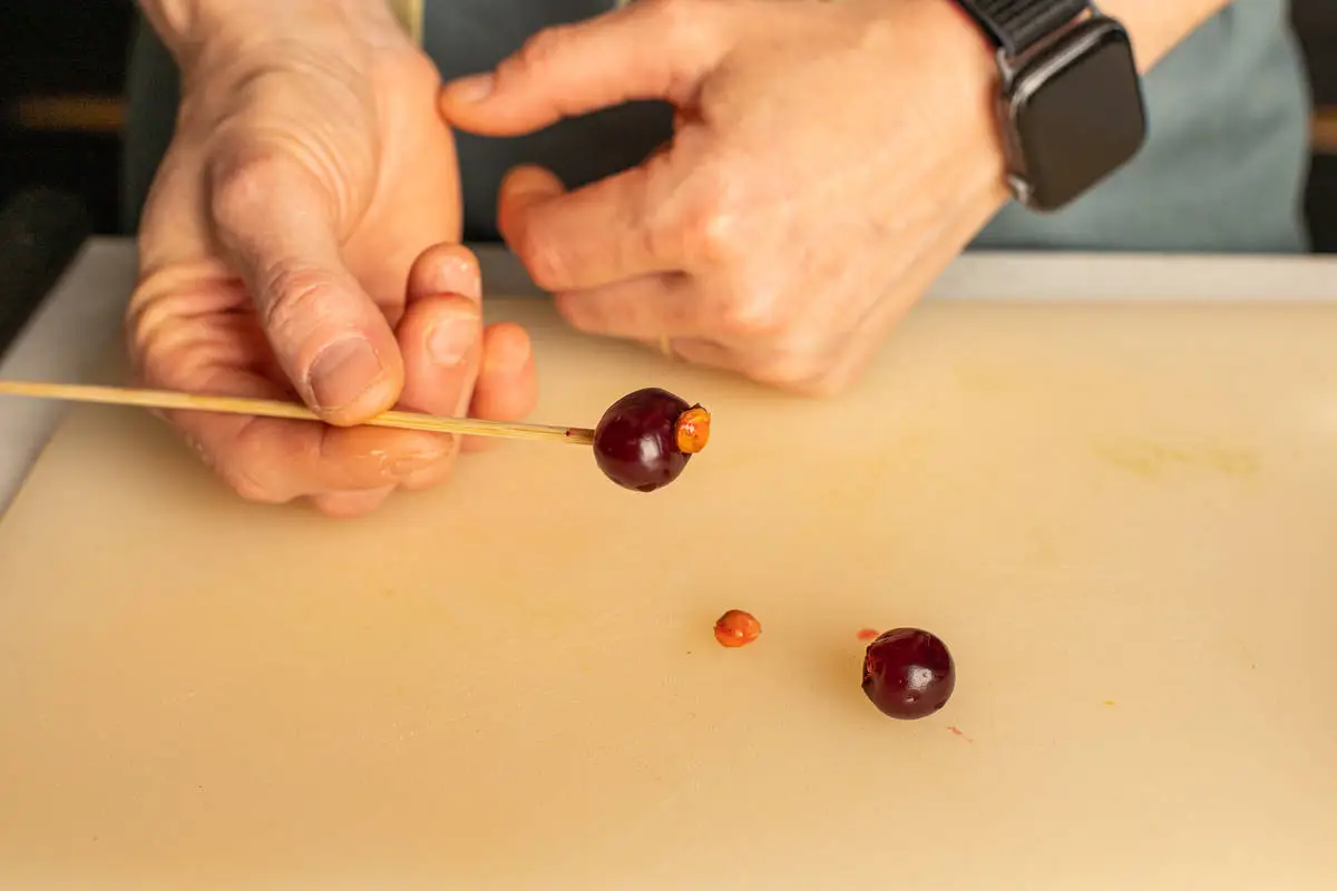Из вишни удалите косточки: это можно сделать специальным приспособлением или обычной деревянной шпажкой, просто выдавив косточку острым концом. Этот шаг можно пропустить и сварить вишню прямо с косточками, но такой компот нельзя хранить дольше года.