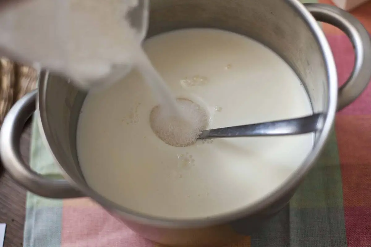 Всыпьте сахар и поставьте на огонь. Доведите до кипения, уменьшите огонь и варите 1,5 — 2 часа, периодически помешивая. Сначала будет казаться, что ничего не происходит, но затем молоко начнет темнеть, карамелизироваться и в итоге превратится в густую массу.
