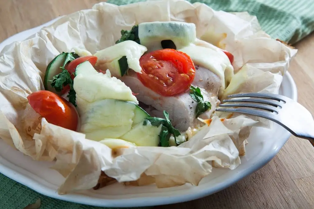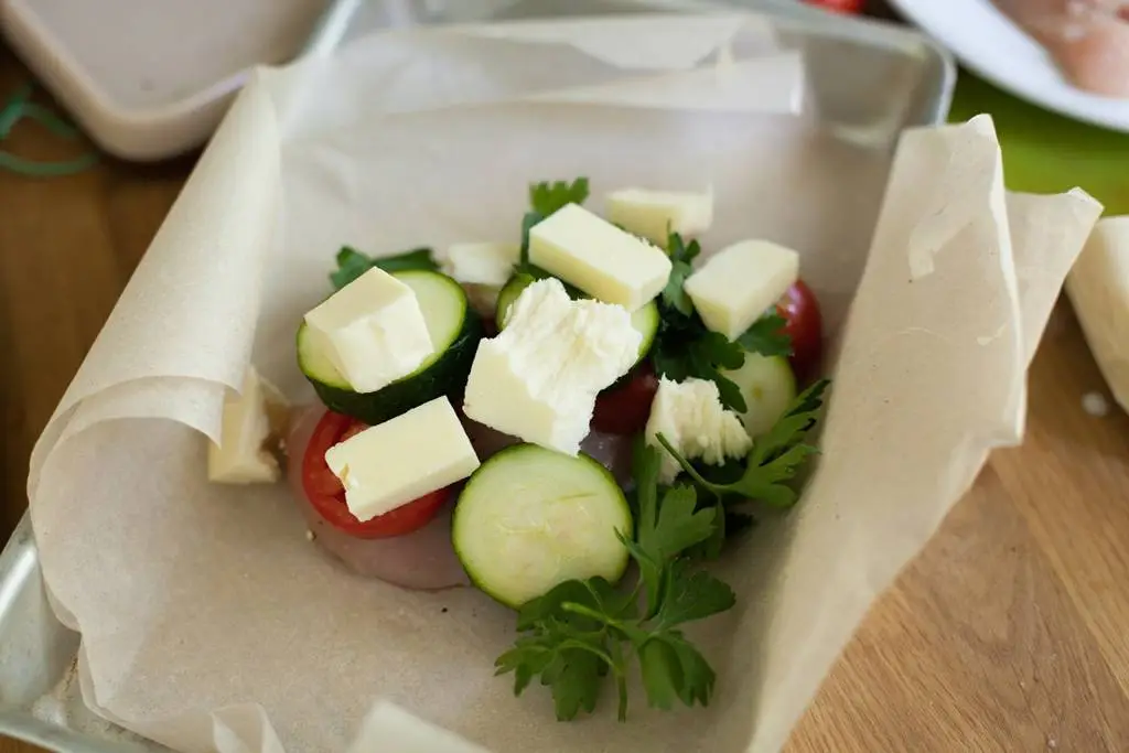 Отрежьте два больших квадрата бумаги для выпечки, в центр каждого положите грудку, слегка сбрызните оливковым маслом, разложите сверху овощи и петрушку, кусочки сыра.