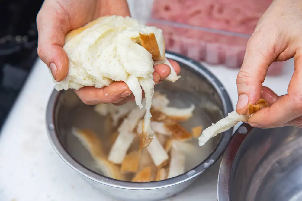 Хлеб замочите в воде на 10 минут (можно замачивать и в молоке, но принципиально на вкусе это не отразится). Уберите жёсткие корочки, мякиш отожмите, чтобы не насыщать фарш лишней жидкостью.