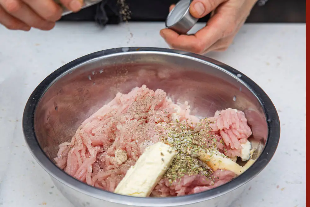 Добавьте хлебный мякиш к фаршу, посолите и поперчите. Положите мягкое сливочное масло — оно придаст более нежный вкус котлетам. Всыпьте орегано, эта сушёная зелень отлично подчёркивает вкус индейки. Добавьте лук.