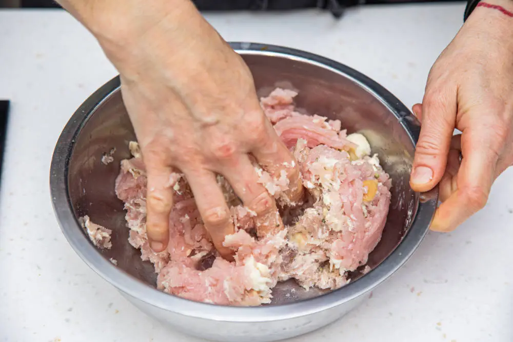 Всё перемешайте. Тщательно вымешайте руками фарш, чтобы он стал однородным и липким, а клейковина, содержащаяся в хлебе, начала работать.