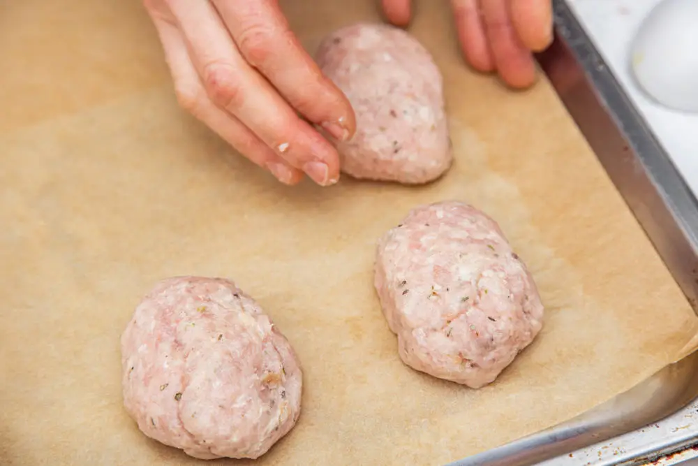 Застелите противень пергаментом для выпечки и выложите на него получившиеся котлеты. Поставьте в разогретую до 200 °C в духовку на 20-25 минут. Важно помещать котлеты именно в горячую духовку, а сами котлеты должны быть комнатной температуры, тогда этого времени для их запекания хватит.