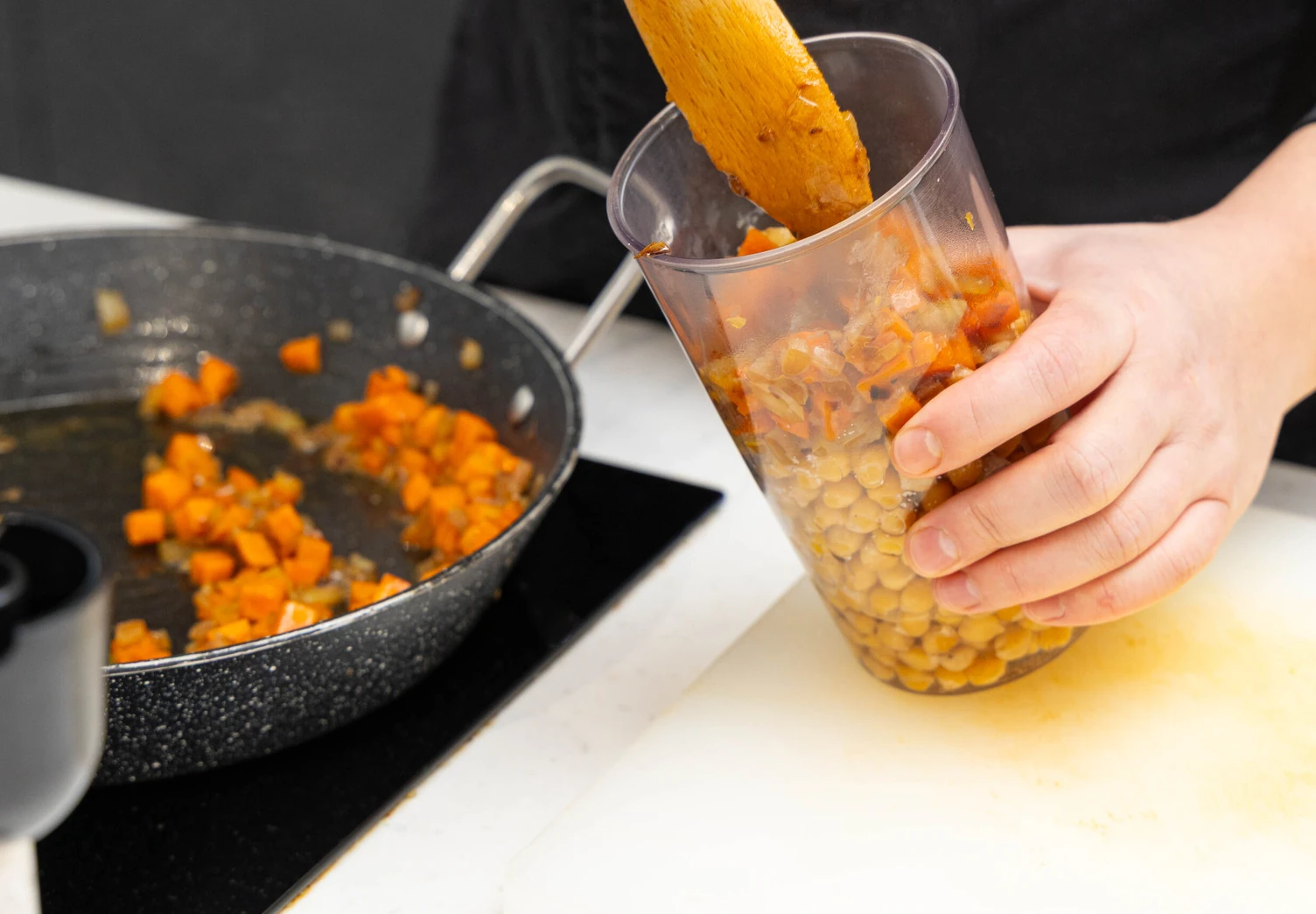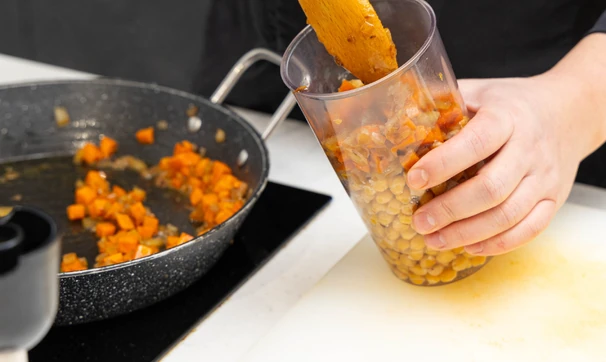Нарежьте лук и морковь соломкой и обжарьте до мягкости. Пропустите через мясорубку варёный нут вместе с обжаренными овощами.