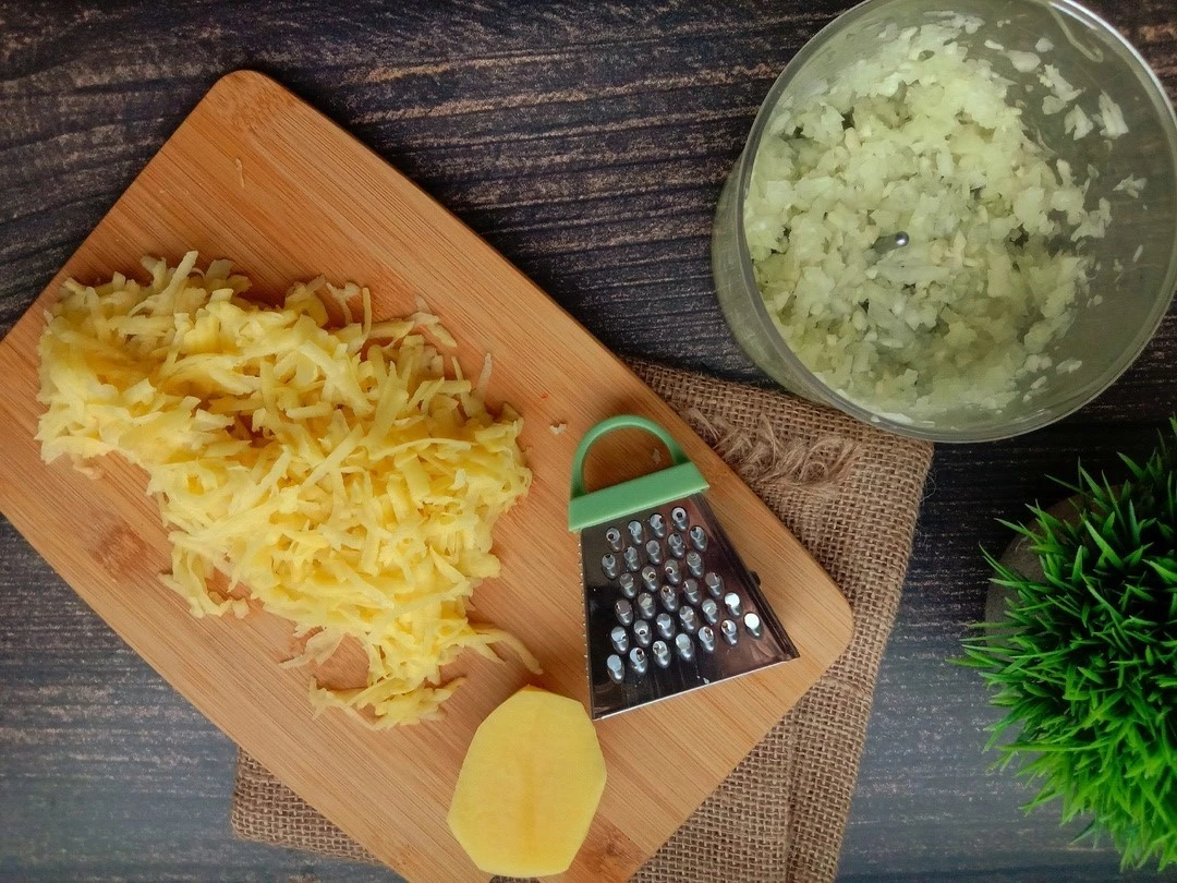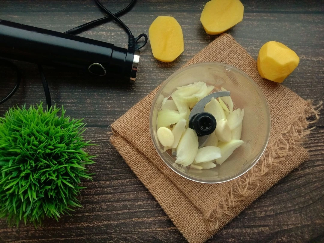 Лук, картофель и чеснок почистите и промойте. Измельчите лук и чеснок в блендере.