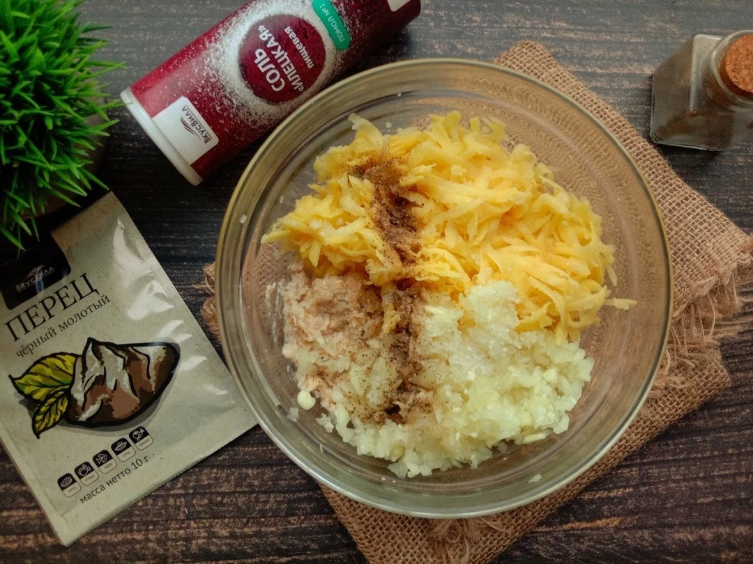 Смешайте овсянку, смесь лука с чесноком и картофель. Посолите и поперчите по вкусу. Тщательно перемешайте полученную массу. Отложите настаиваться на 10–15 минут.