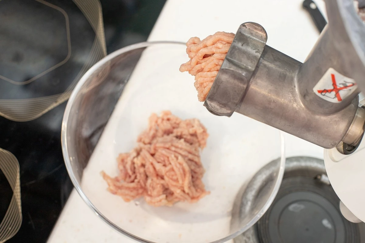 Сливочное масло заранее уберите в морозилку. Нарежьте филе бедра и филе грудки цыплёнка на кусочки и прокрутите через мясорубку.