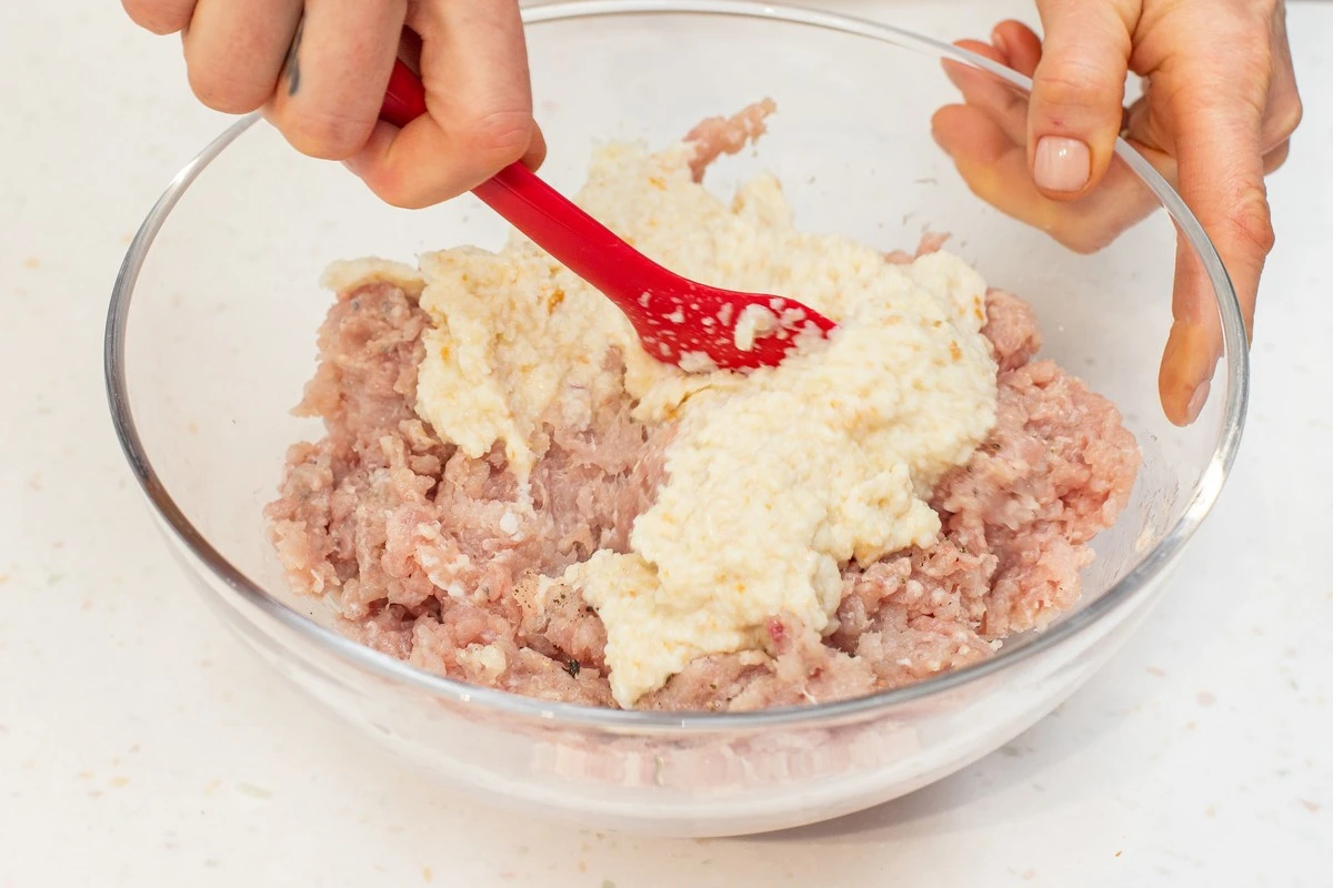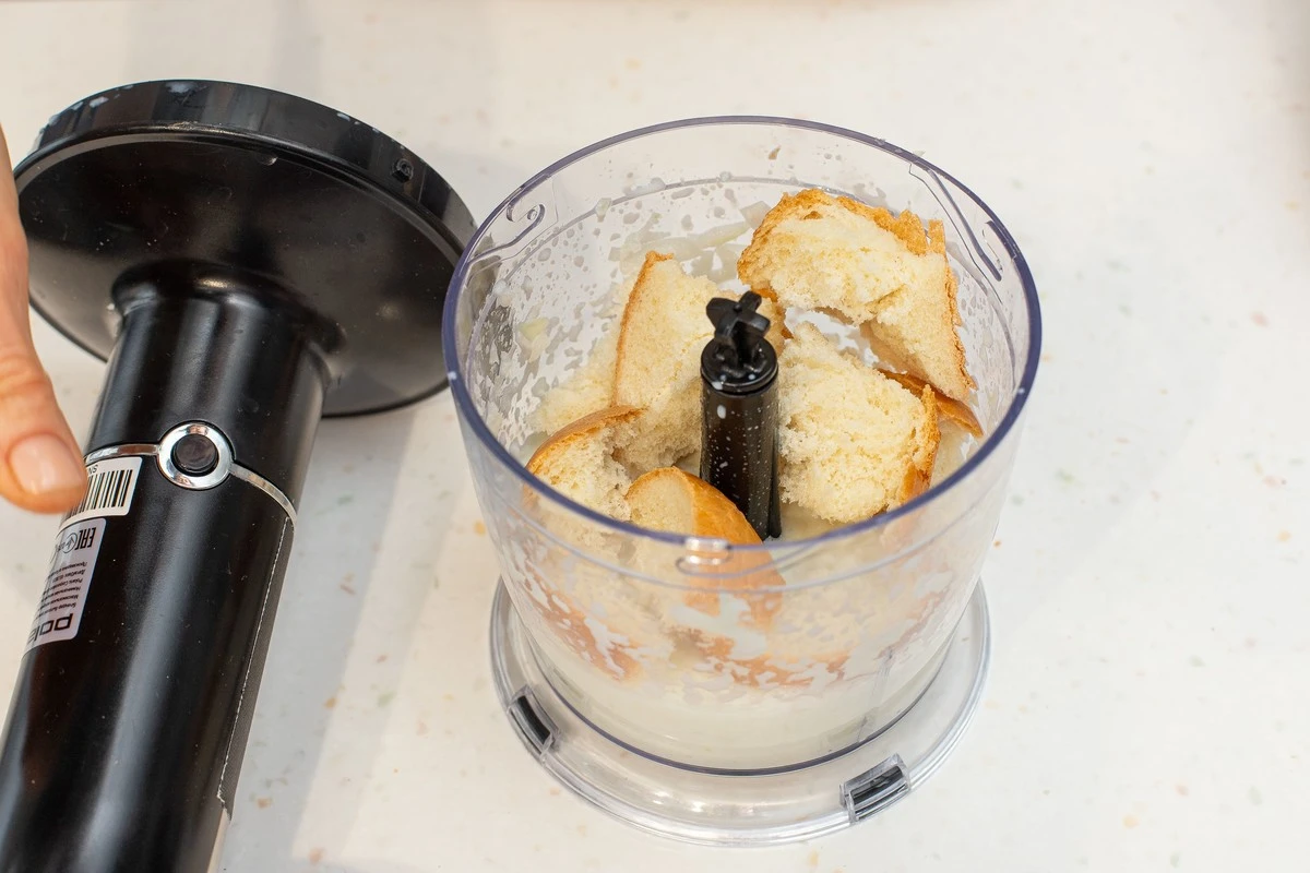 Луковицу почистите, крупно нарежьте и измельчите блендером. Добавьте молоко и 2 кусочка хлеба и измельчите всё вместе. Оставшийся хлеб уберите в морозилку на час.