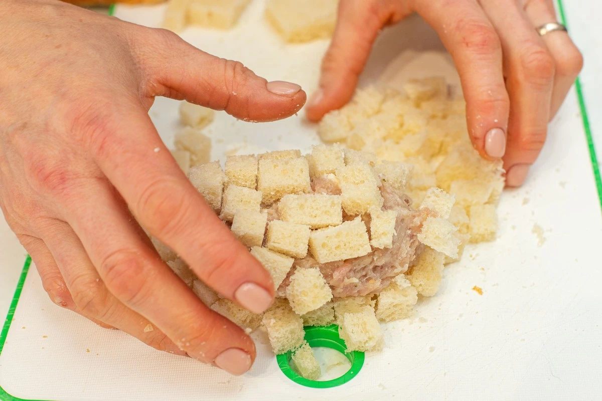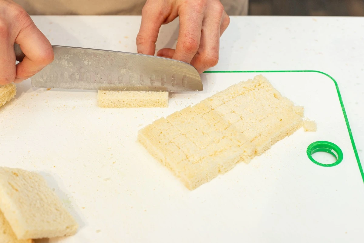 Достаньте подмороженный хлеб из морозилки и нарежьте кубиками.