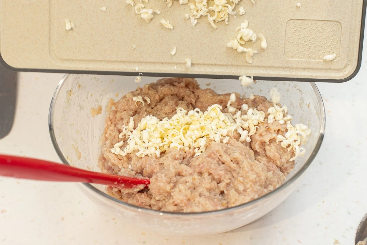 Замороженное сливочное масло натрите на крупной тёрке и добавьте в фарш. Перемешайте.