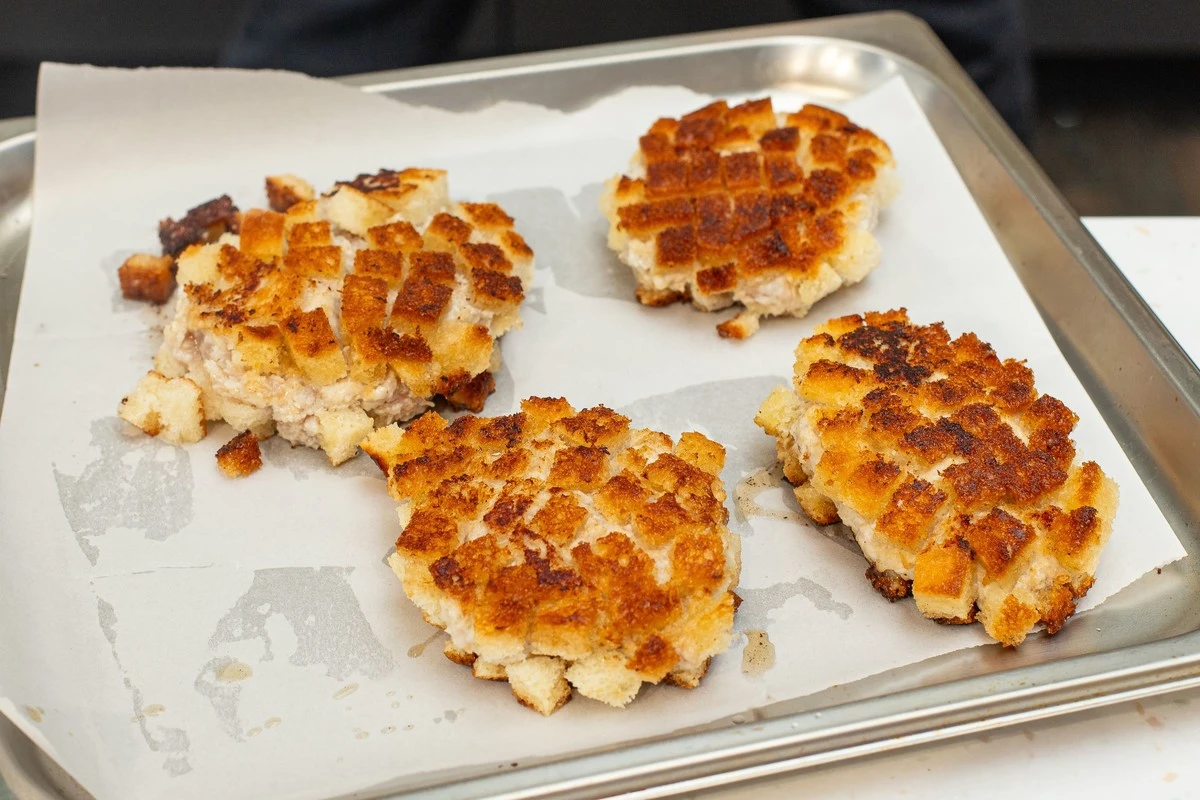 Выложите на часть хлебных кубиков 1 ст. л. фарша и сформируйте котлеты, обваленные в хлебе. На сковороду налейте 1 ст. л. растительного масла и положите 1 ст. л. сливочного, растопите и перемешайте. Обжаривайте котлеты на масле на сковороде примерно по 4 минуты с каждой стороны.