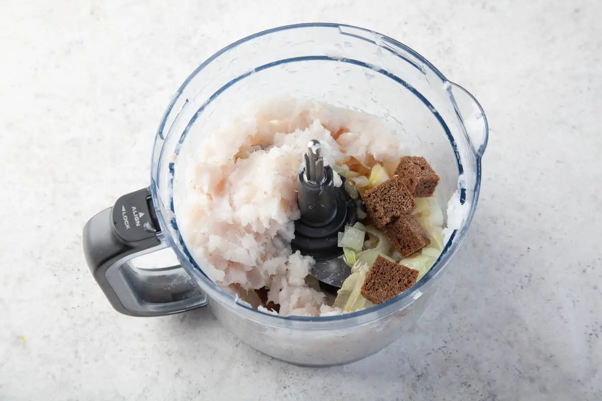 В чашу блендера сложите рыбу, лук, яйцо и хлеб без корочки, посолите.