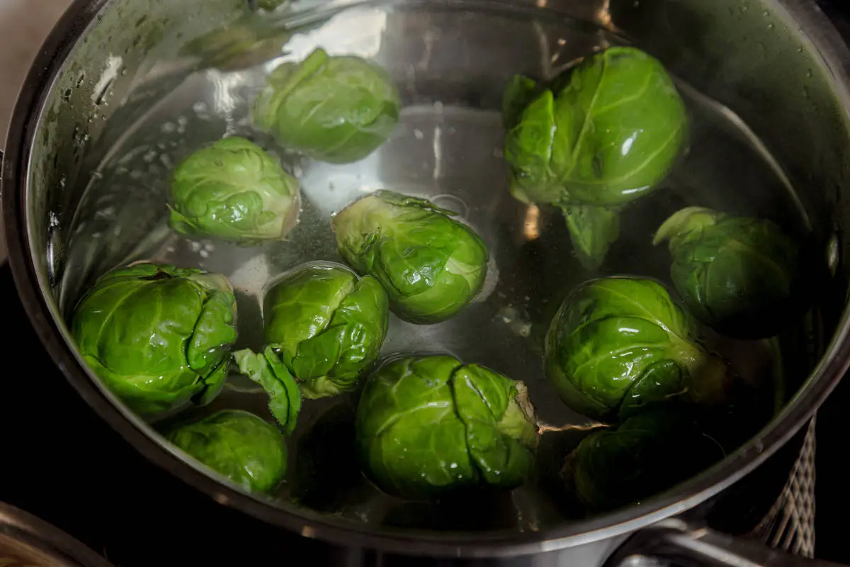 Брюссельскую капусту бланшируйте 5 минут в кипящей подсоленной воде, затем переложите в холодную воду.