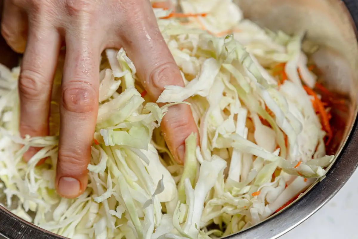 Белокочанную капусту тонко нашинкуйте, помните руками с солью. Морковь очистите и измельчите на тёрке для корейской моркови. Яблоко нарежьте тонкой соломкой.