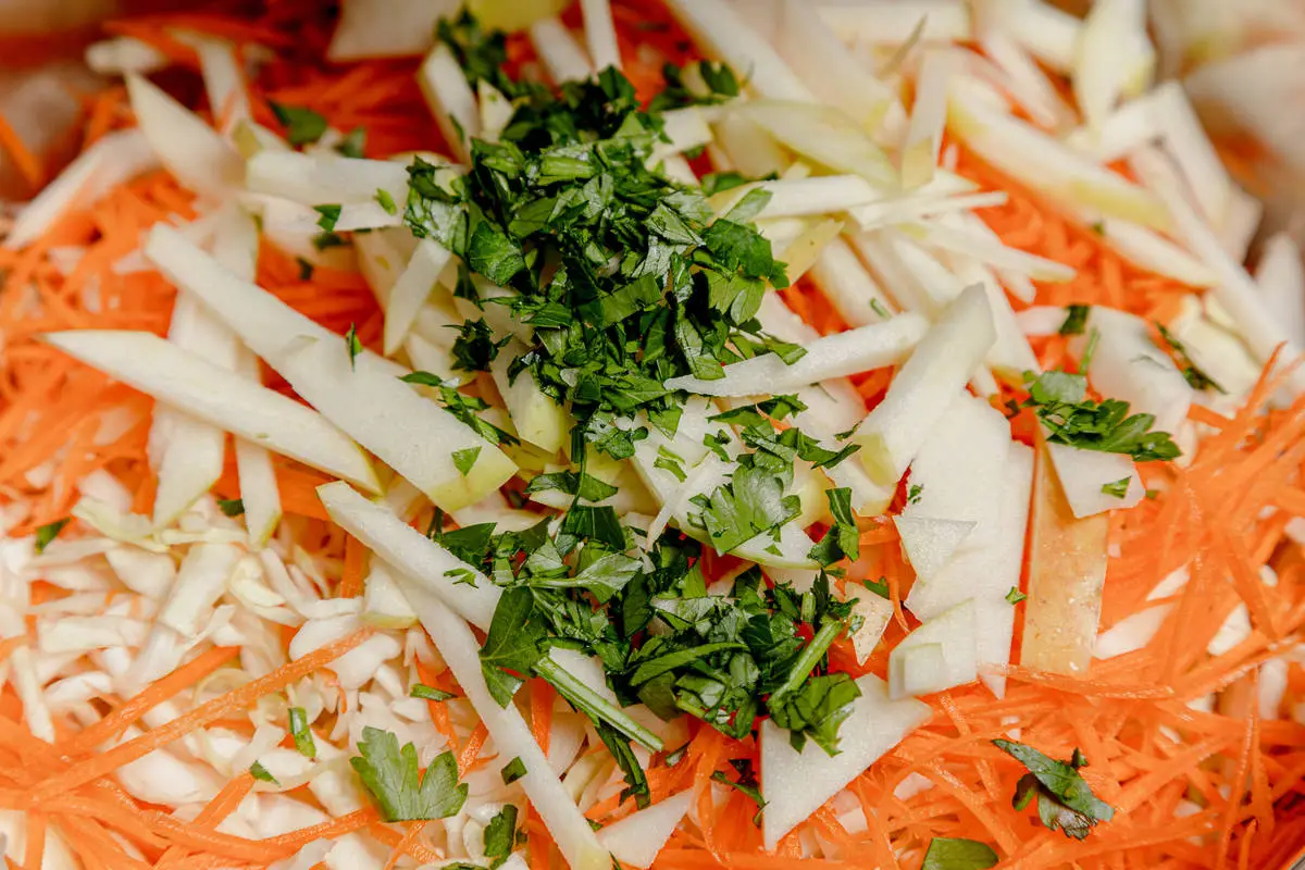 Смешайте капусту, морковь, яблоко и нарезанную петрушку.