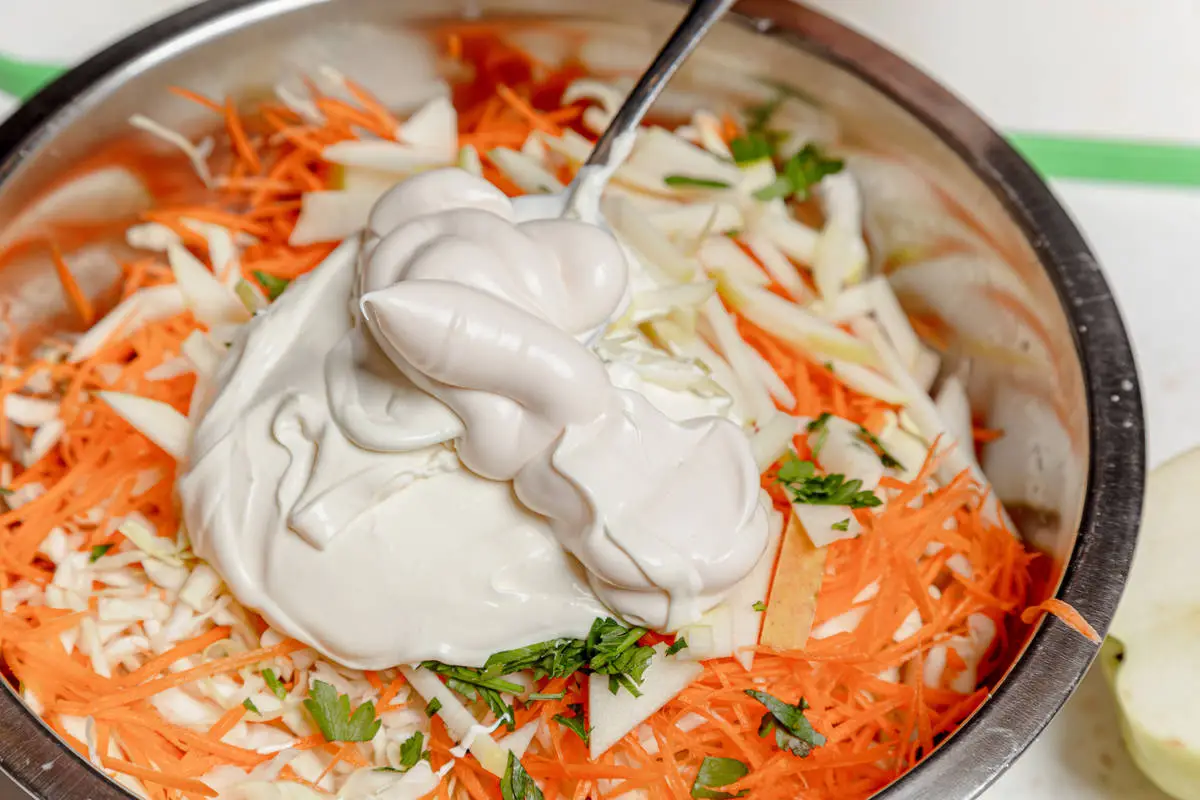 Заправьте сметаной и майонезом, перемешайте, при необходимости подсолите.
