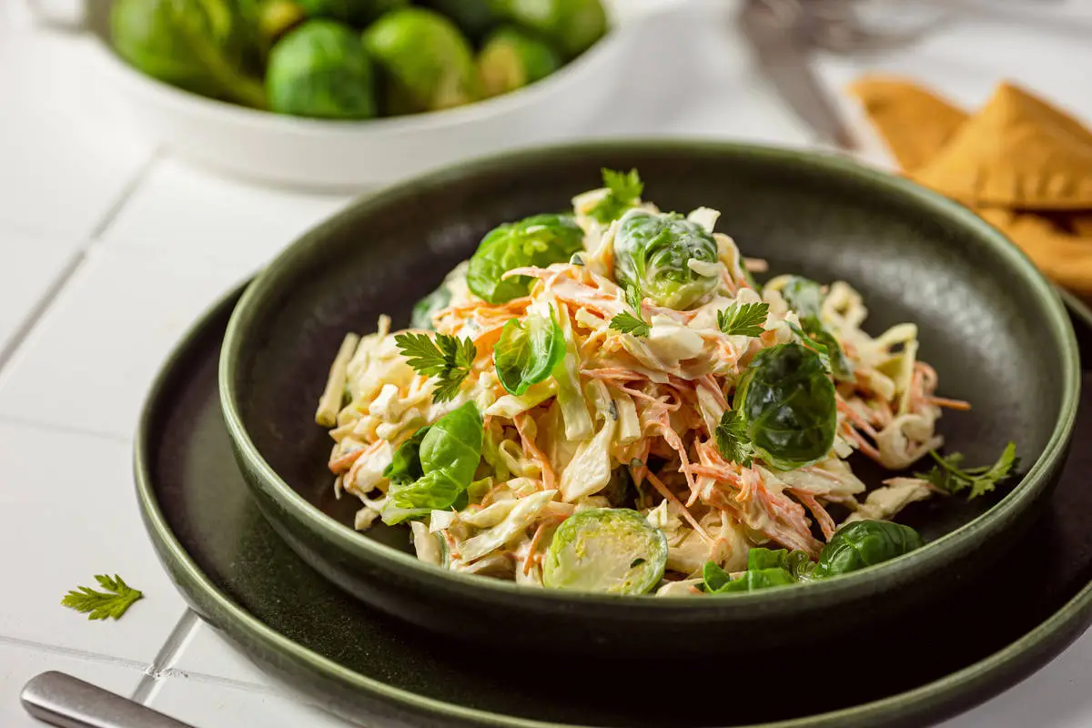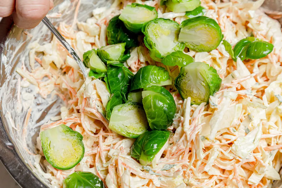 Если в классический коул слоу добавить бланшированную брюссельскую капусту, то салат из повседневного превратится в ваш фирменный для особых случаев. Такой не стыдно подать в качестве гарнира к запечённому мясу или праздничной утке.