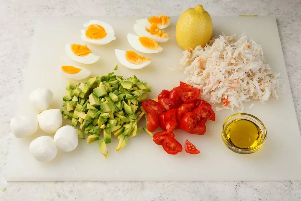 Мясо краба разморозьте заранее в холодильнике или в холодной воде прямо в упаковке 30-40 минут. Яйца отварите вкрутую, остудите в холодной воде, очистите от скорлупы и нарежьте четвертинками. Авокадо нарежьте кубиками, полейте лимонным соком. Томаты черри нарежьте половинками, моцареллу – кружочками. Мясо краба обсушите, разберите пальцами, удаляя хитиновые пластинки, если попадаются.