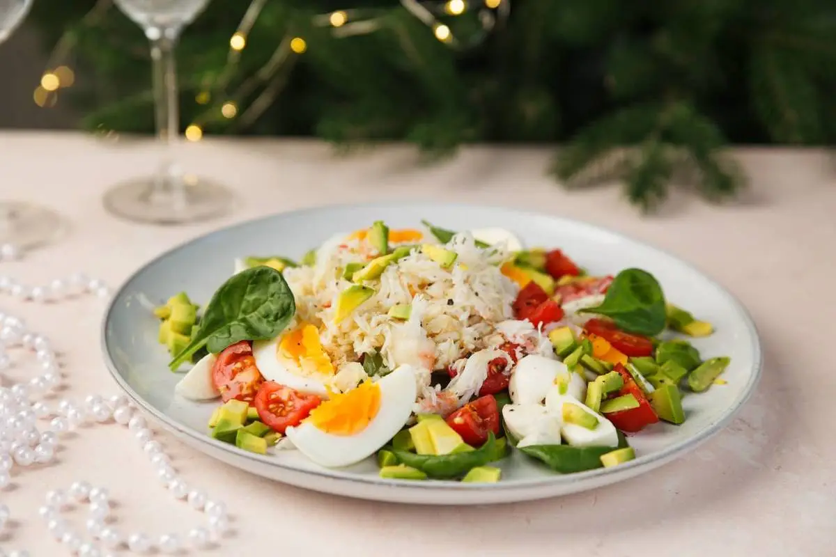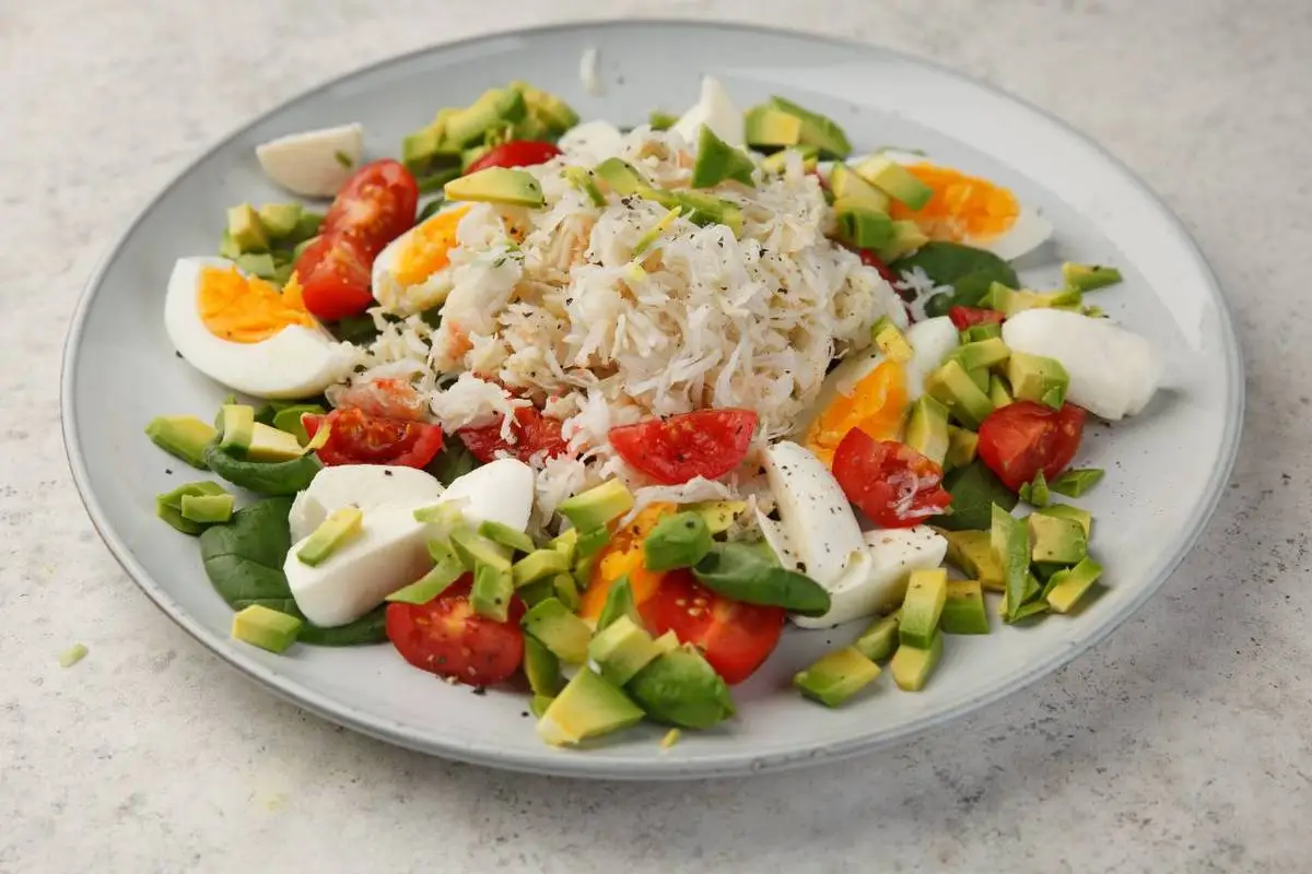 Промытый и обсушенный шпинат выложите на тарелку, сверху – краба, томаты, авокадо. Разложите четвертинки яиц. Для заправки смешайте оливковое масло и лимонный сок с солью, взбейте вилкой и заправьте салат. Также этот салат можно по желанию заправить небольшим количеством майонеза.