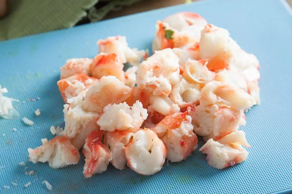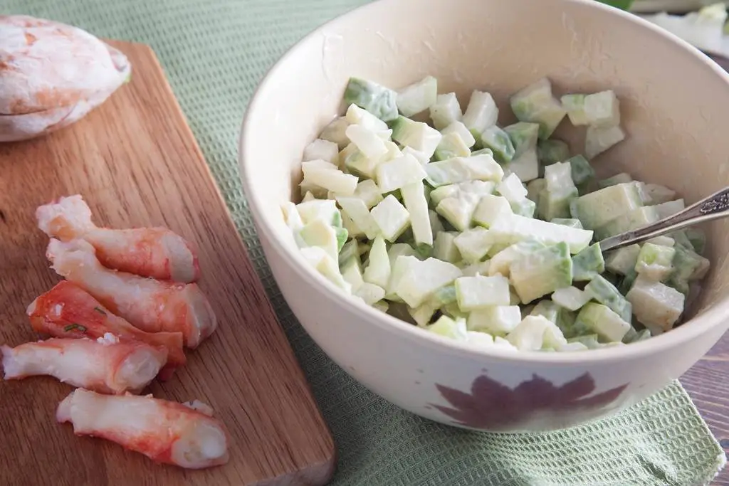 Коленца краба предварительно разморозьте на самой холодной полке холодильника, ополосните, очистите от хитиновых пластинок и порежьте, несколько коленец оставьте для целыми.