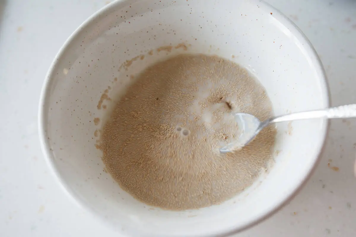 Для опары подогрейте молоко (оно должно быть тёплым, не горячим), добавьте дрожжи и по одной чайной ложке муки и сахара, перемешайте и оставьте в тёплом месте на 10-15 минут. Опара должна подняться — это значит, что дрожжи «работают» и можно продолжать.