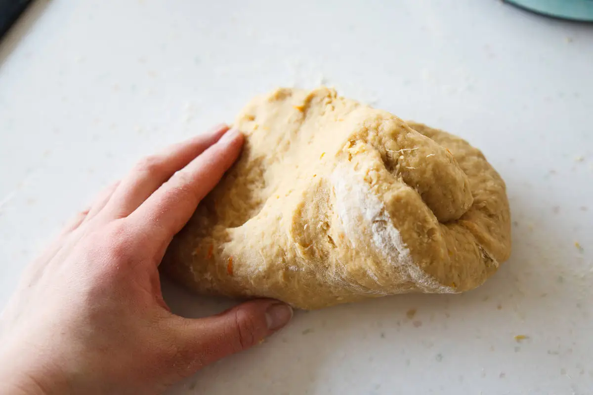 Просейте 350 г муки в большую миску, добавьте опару, взбитые с сахаром яйца, соль, растопленное масло, натрите цедру апельсина и выдавите сок из половинки. Замесите тесто и вымешивайте, понемногу добавляя муку, пока оно не перестанет липнуть к рукам. Месите около 10 минут, затем скатайте в шар, накройте пищевой плёнкой и уберите в тёплое место примерно на 1,5 часа.