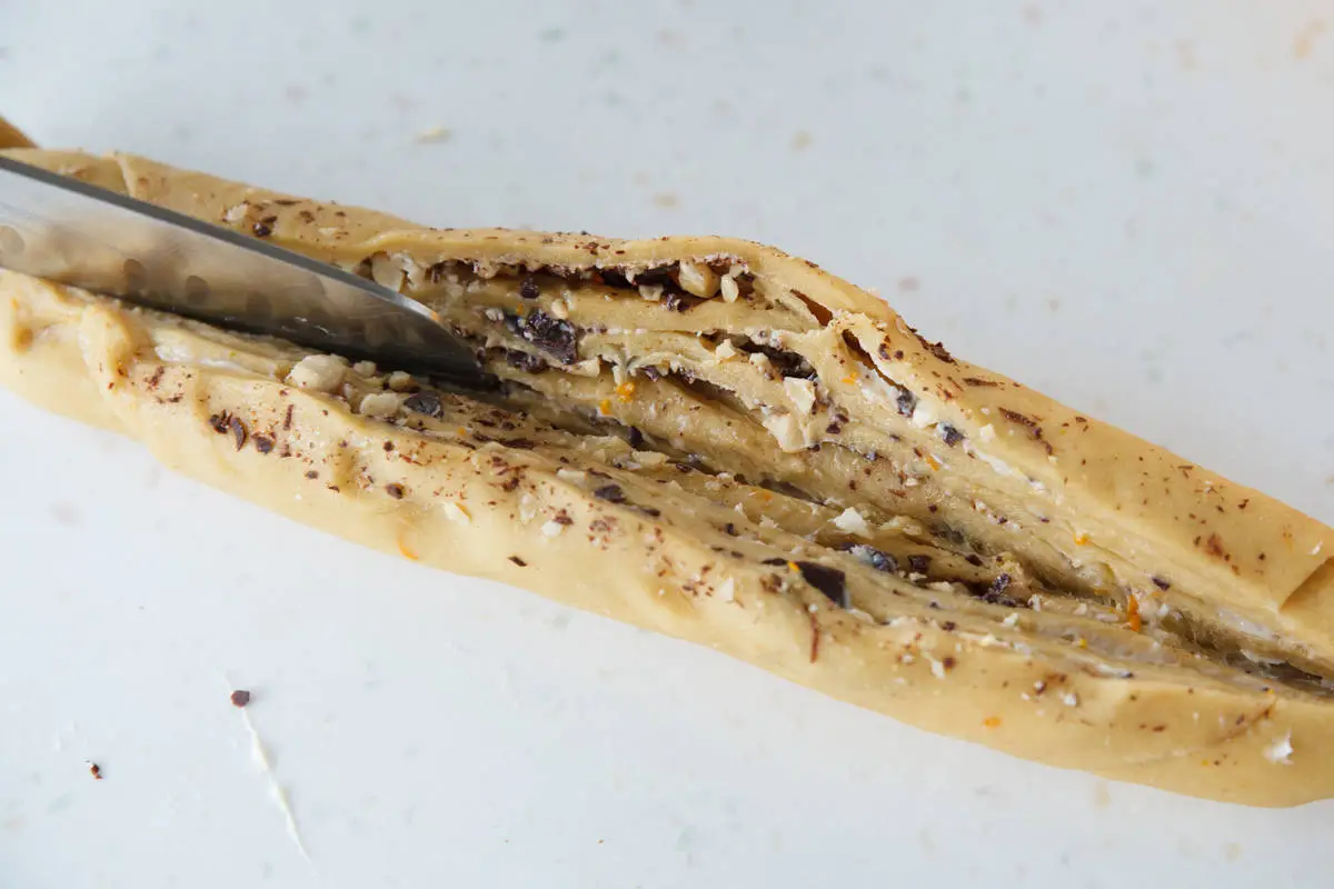 Каждый шар раскатайте тонко в прямоугольник, смажьте мягким маслом, посыпьте смесью орехов и шоколада, скрутите плотно в рулет. Затем разрежьте рулеты вдоль острым ножом, не прорезая до конца, и выверните наизнанку, чтобы были видны слои. Аккуратно уложите рулеты в форму для выпечки один на другой, формируя краффин. Оставьте тесто подниматься в тёплом месте ещё на 1 час.