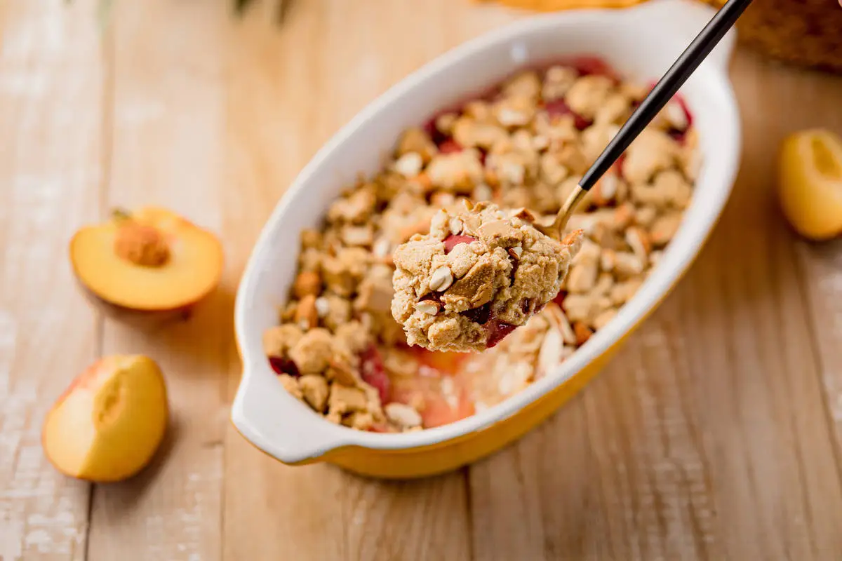 Персики разрежьте пополам, удалите косточки. Выложите в форму срезами вниз. Сверху насыпьте крошку из теста.