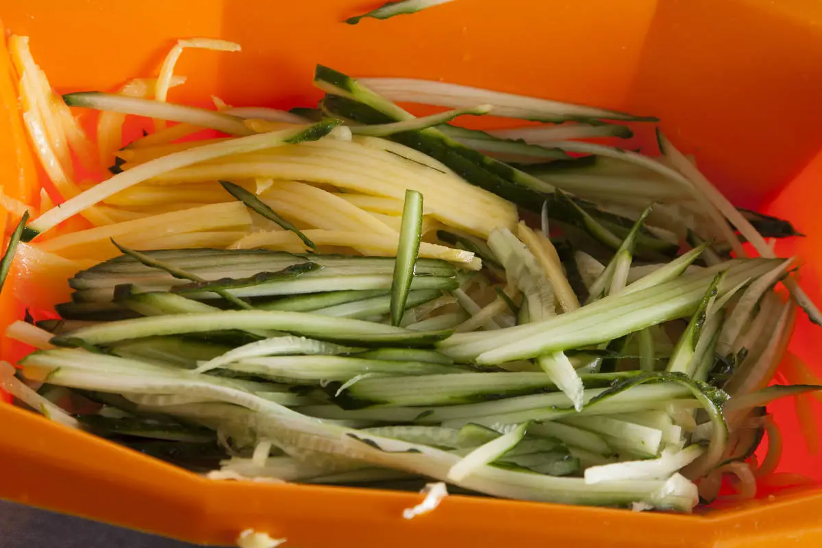 Манго отчистите от кожуры и удалите косточку. Огурцы и манго нартите на терке для корейской морковки.