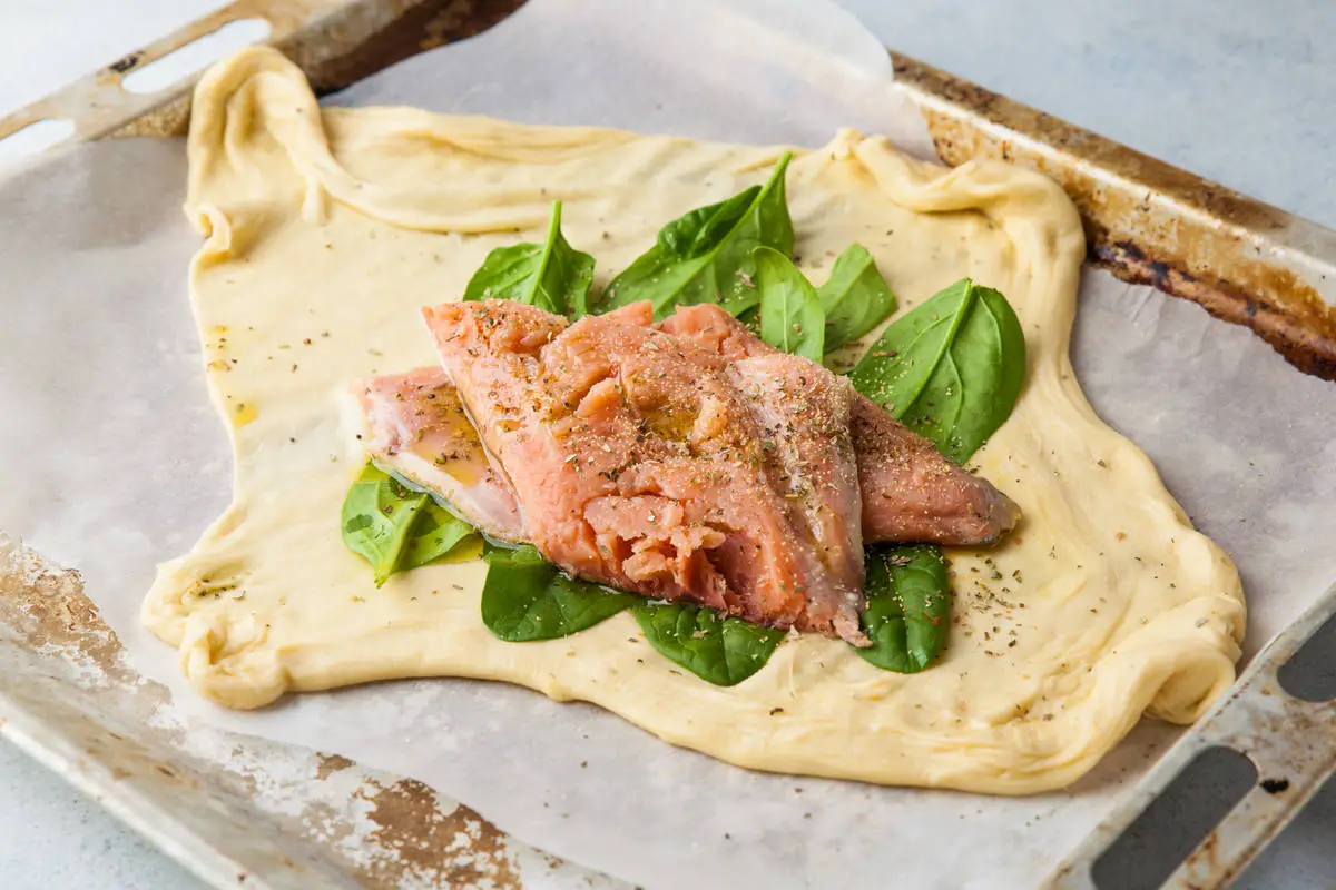 Выложите на тесто шпинат, а сверху — рыбу. Посолите и поперчите. Сверните тесто конвертиком. Промажьте взбитым яйцом.