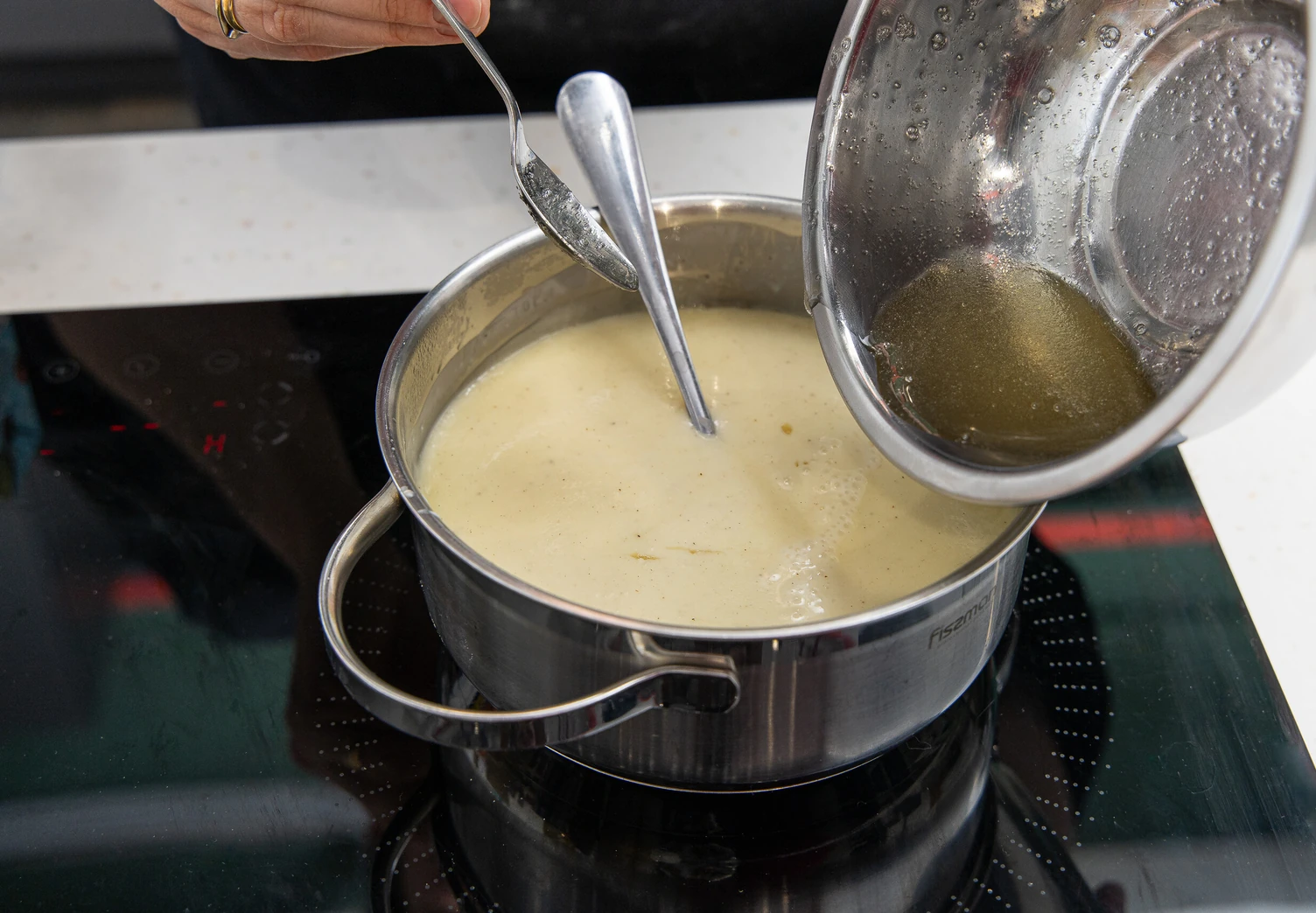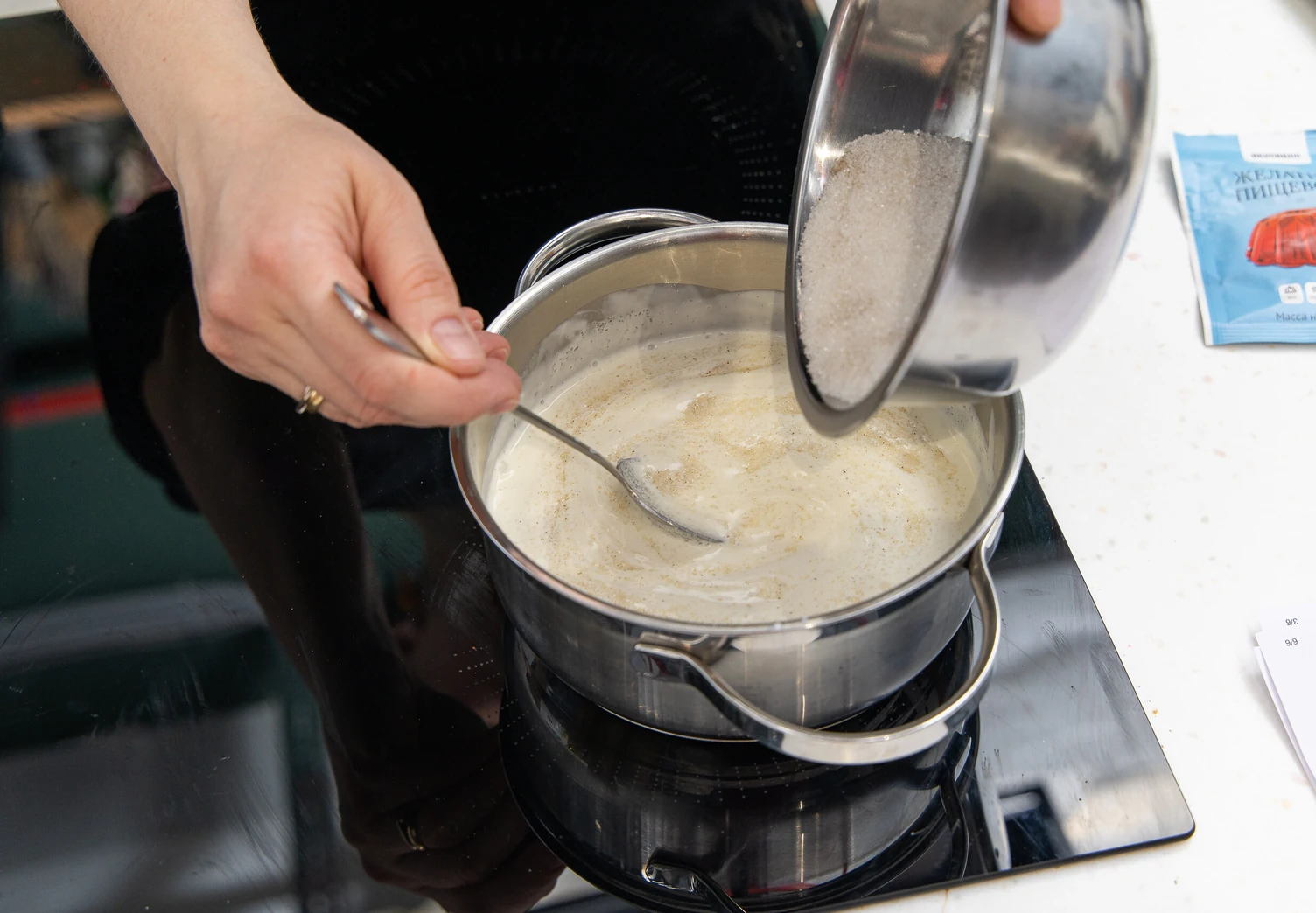 Добавьте в горячие сливки разбухший желатин. Тщательно перемешивайте, пока желатин полностью не растворится.