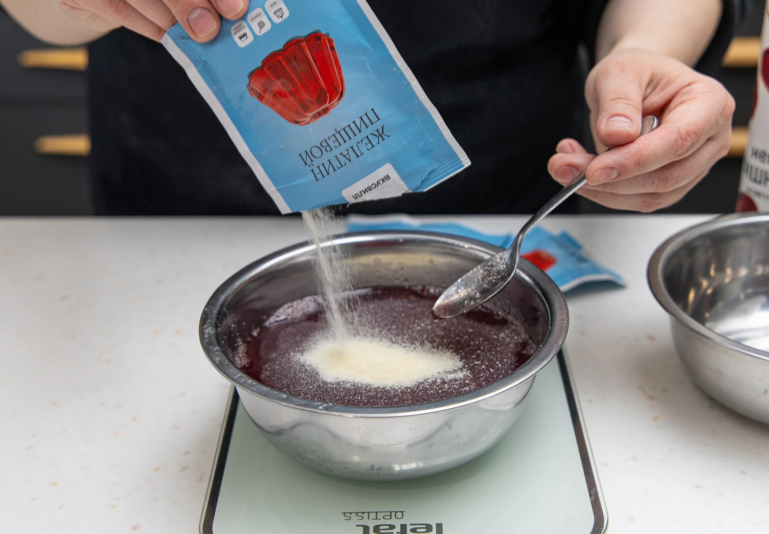 Для красного слоя аккуратно разведите оставшийся желатин в соке по инструкции на предыдущих шагах (дайте ему набухнуть, а затем растворите, слегка нагрев).