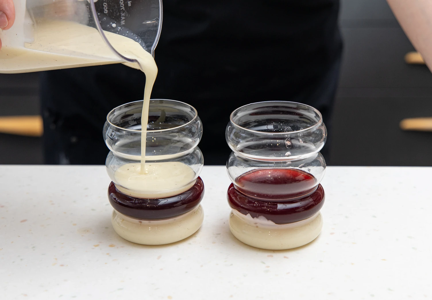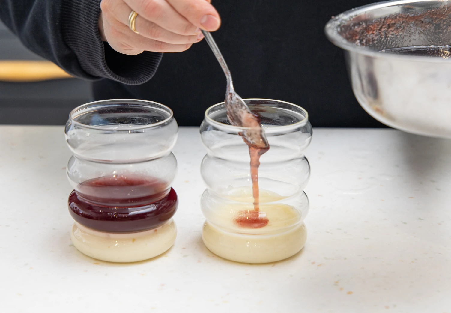 Поверх вишневого слоя залейте оставшееся ванильное желе. Если крем успел загустеть, подогрейте его на медленном огне.