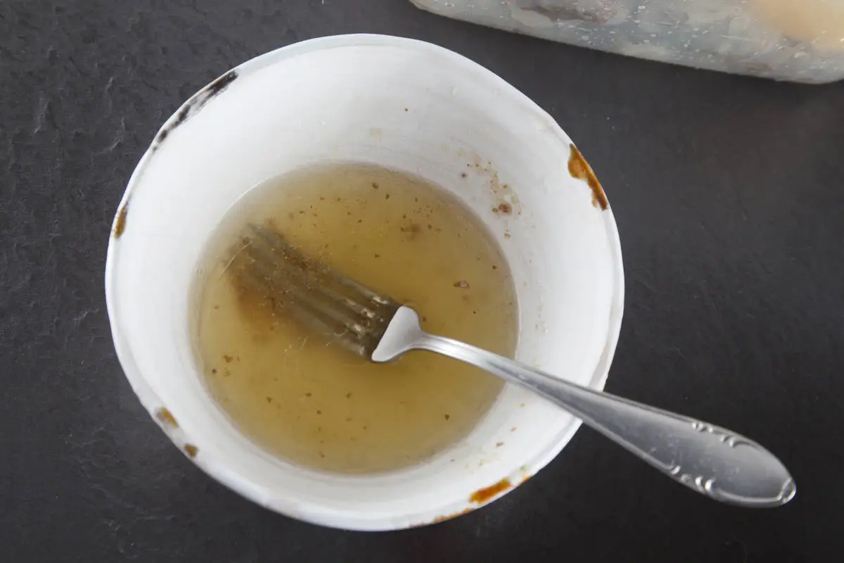 Смешайте сок лайма с маслом и соевым соусом, взбейте вилкой, добавьте порубленный чеснок и кунжут.