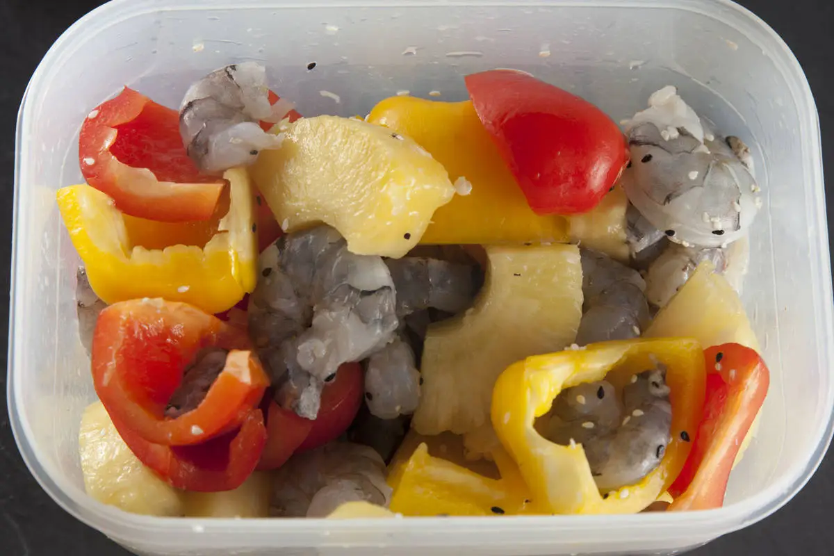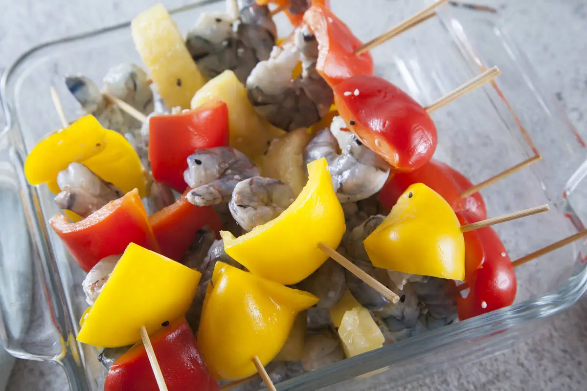 Получившимся маринадом залейте креветки, перец и ананас, перемешайте, оставьте на 15 минут. Если готовите блюдо заранее, то можно сразу нанизать креветки на шпажки и оставить в холодильнике, а за 20 минут до начала приготовления залить маринадом.