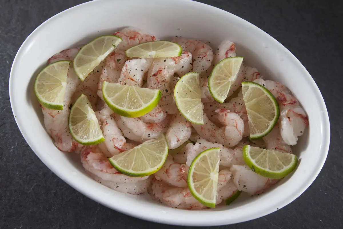 Креветки выложите в форму для запекания, полейте соком лайма, выложите кружочки лайма, поперчите, посолите.
