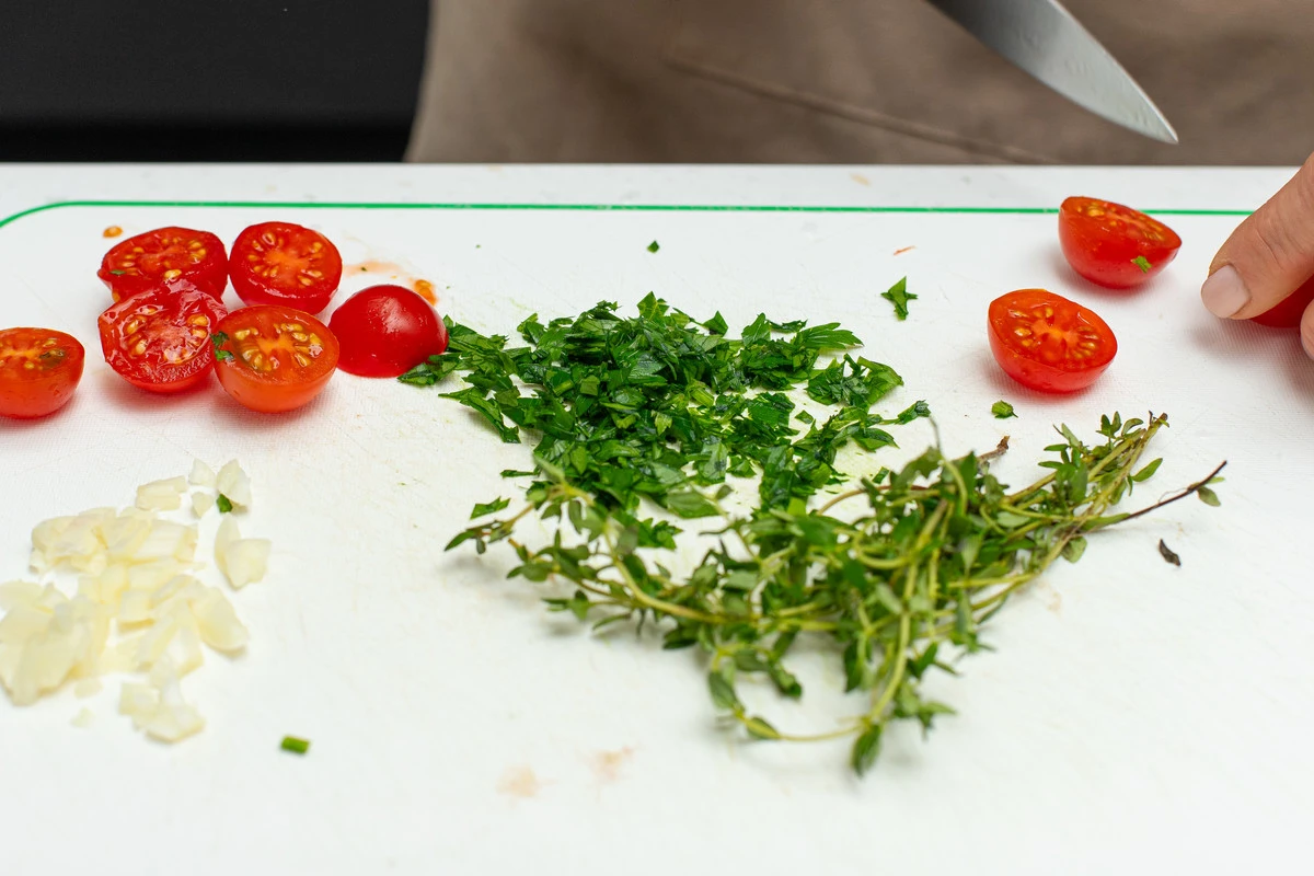 Креветки разморозьте. Петрушку и чеснок мелко нарежьте. Помидоры черри разрежьте пополам.