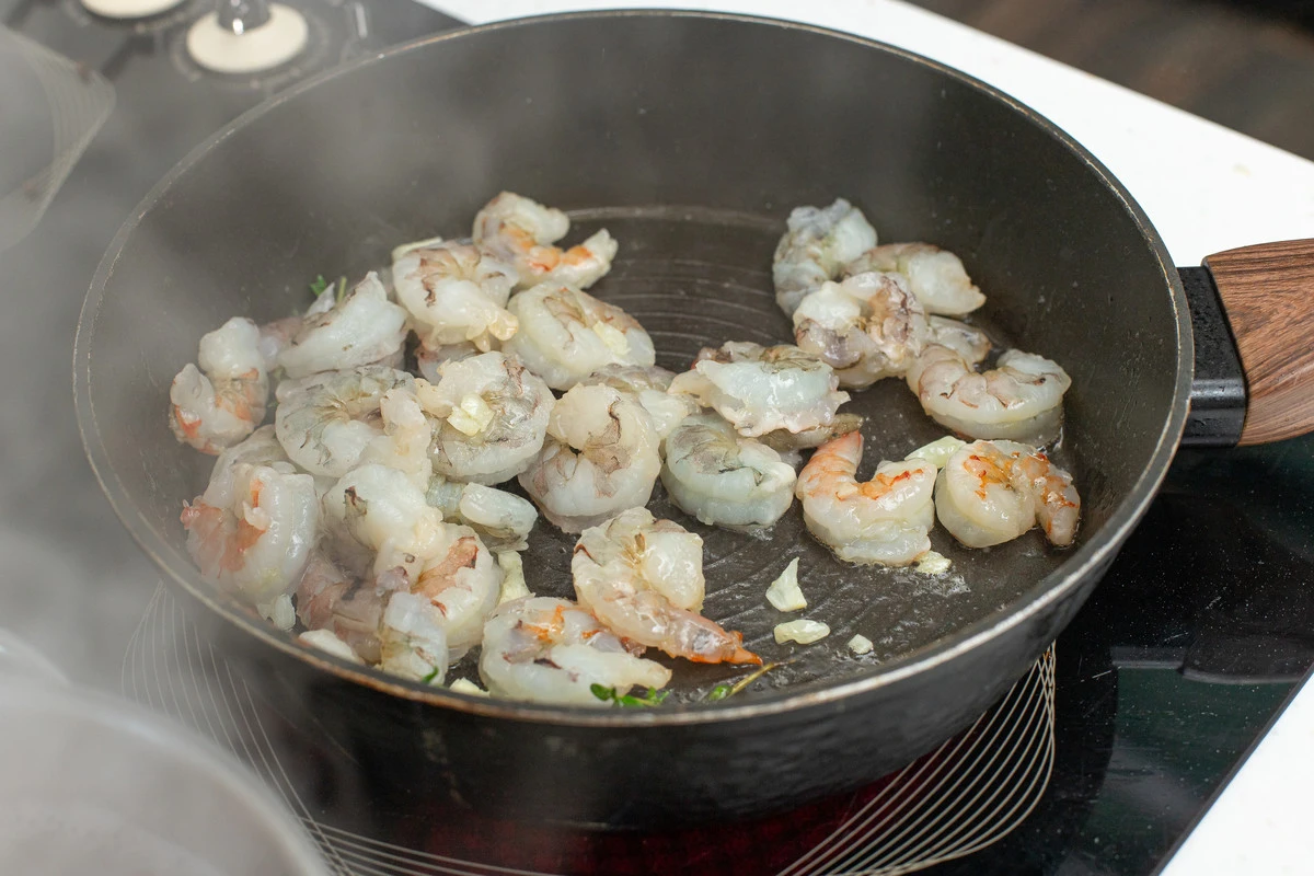 Разогрейте сковороду с растительным маслом. Выложите в неё чеснок, размороженные креветки, веточки тимьяна. Посолите, поперчите, перемешайте. Готовьте на сильном огне примерно 5 минут, периодически помешивая, чтобы креветки не варились, а жарились.