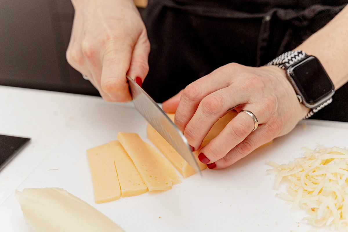 Моцареллу измельчите на тёрке, гауду нарежьте ломтиками. Маринованные огурчики нарежьте колечками.